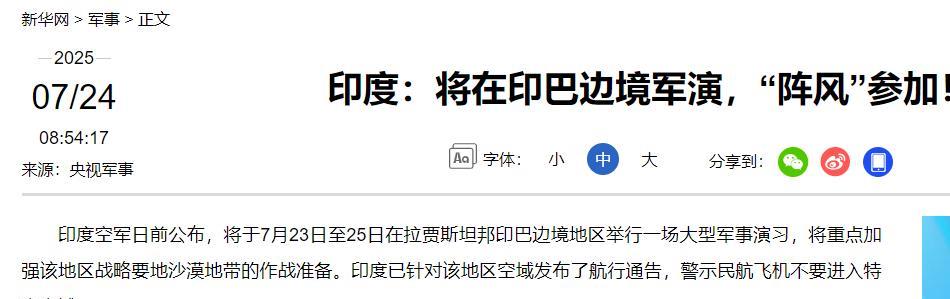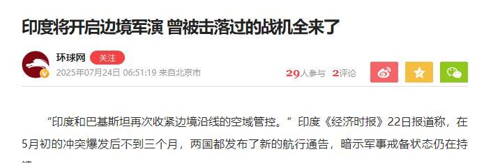 印度战机突然逼近巴基斯坦,结果自己先怂了? 7月23日,印度空军在距巴基斯坦边境50公里处,展开大规模演习,出动“阵风”和苏-30MKI等主力机型,试图通过展示武力提升地区威慑力,然而实际表现却与其预期大相径庭。 此次演习中,“阵风”战机在靠近巴基斯坦空域时,疑似遭遇电子干扰,未敢进一步推进便仓促掉头。 而苏-30MKI更是因机械故障中途退出,这一状况与其“空中主力”的定位严重不符,也难怪被网友讥讽为“空中拖拉机”。 要知道,印度为引进36架“阵风”战机耗资88亿美元,单架成本远超国际同类机型,如此高昂的投入,却换来这般难堪的临场表现,其装备体系的性价比问题再次被摆上台面。 面对印度的军事动作,巴基斯坦反应迅速,派出JF-17“雷电”和F-16战机升空拦截。 其中,JF-17配备了中国先进的有源相控阵雷达,和霹雳-15E空空导弹,在态势感知与火力打击能力上,丝毫不逊色于印度的“阵风”。 双方对峙40分钟后,印军战机最终选择撤离,巴方随后发布相关视频,不仅记录了对峙过程,更暗讽印度5月空袭行动的失败。 这种精准的舆论反击,既展现了其军事自信,也凸显了对印军实际战力的清晰认知。 从深层原因来看,当前莫迪政府在大选前支持率持续下滑,国内物价高企、就业形势严峻,GDP增速甚至被越南超越,民生问题已成为制约其连任的关键因素。 在此背景下,通过制造边境紧张局势转移国内视线,试图以“军事强硬”形象挽回选民支持,成为其惯用的政治伎俩。 然而这种投机行为显然未能达到预期效果,反而因战机的糟糕表现,引发国内对军费投入合理性的广泛质疑。 高价引进的战机半数时间处于趴窝状态,维护成本居高不下,而普通民众更关心的是生活能否有保障,不同的关注重点让这场军演沦为舆论笑柄。 相比于印度无效军演,巴基斯坦的反制措施则更为务实,除了此次有效拦截外,巴方近期追加订购了中国新型潜艇。 并成功试射了具备核打击能力的巡航导弹,通过强化海基核力量与远程打击能力,构建多层次威慑体系。 而印度则计划加速部署S-400防空系统,试图通过引进俄制先进装备弥补空中防御短板,但该系统与现有装备的兼容性问题,以及漫长的调试周期,使其短期内难以形成有效战力。 值得注意的是,中俄两国近期明确呼吁,防止外部势力干涉南亚事务,实则直指美国对印军售,加剧地区军备竞赛的行为。 美国为拉拢印度制衡地区格局,近年来不断放宽对印高端武器出口限制,这种带有地缘政治私利的军售,不仅推高了南亚地区的军事对抗风险,也使得印度在装备体系上陷入“万国牌”的困境。 不同国家的武器系统缺乏协同性,后勤维护复杂低效,这也是此次演习中装备故障频发的重要原因之一。 社交媒体上,印巴两国网民的激烈交锋,将这场军事对峙延伸至舆论场,相关话题阅读量突破亿次。 但无论舆论如何发酵,此次事件都清晰表明,军事力量的强弱并非单纯取决于装备价格,更在于体系整合、人员素养与实际运用能力。
