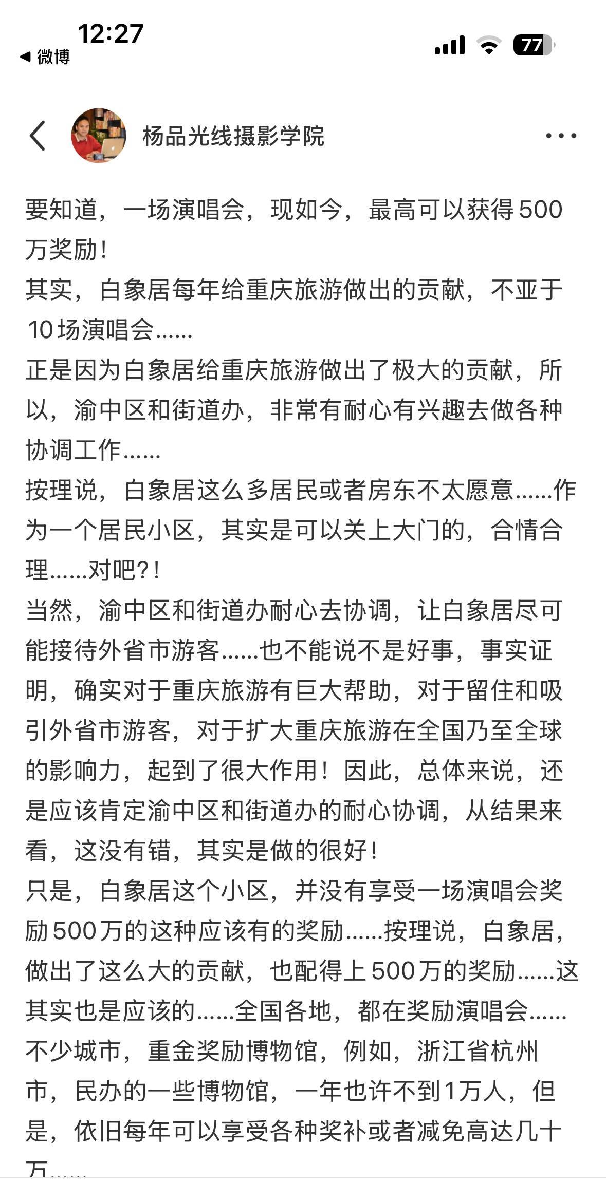 有人说,“重庆哈儿山对重庆旅游和口碑的破坏也远远不止500万”,这个,怎么讲呢?!难道,三亚,大理,丽江,九寨沟,西双版纳,桂林,北京一日游……口碑就很好了吗?!难道,重庆江北机场,重庆西站,重庆北站,华岩寺,磁器口古镇,洪崖洞……坑人的,宰客的,坑蒙拐骗的,还少了吗?!口碑就很好了吗?! 其实,要正确看待嘛! 洪崖洞,对于重庆旅游,肯定是第一号功臣,是居功至伟的!这一点,是不要质疑的! 但是,洪崖洞这里的乱象丛生,这么多年来,哪一年,没有爆出来过一些坏人坏事呢?! 但是,即便最近洪崖洞口碑这么差,可是,7月24日,我在洪崖洞这一带看到的,依旧是游客很多,摆摊的小摊小贩很多……还是很热闹的嘛! 三亚旅游,每年都会有口碑崩盘的时候吧?!但是,清静一段时间之后呢?! 所以……还是要辩证的看问题嘛! 公司,都是有问题的! 人,都是有病的! 哪个公司没有问题!马云的阿里巴巴,问题多得很,但是,马云说呢,不准基础员工上来就洋洋万言书,好像不是马云说的,是华为任正非说的吧?!大家觉得呢?! #光线摄影世界曾兰谈天说地#