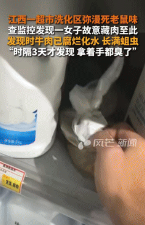 “坏了良心!”江西吉安,一超市员工在洗化区闻到“死老鼠味”,几经寻找,发现在沐浴露后面,藏着一块已经生了蛆的牛肉,员工拿在手里,手都是臭的,为找出是谁在恶作剧,员工调取了监控,不料,视频显示的画面让她大吃一惊,网友:得多无聊才能做出这种缺德事!