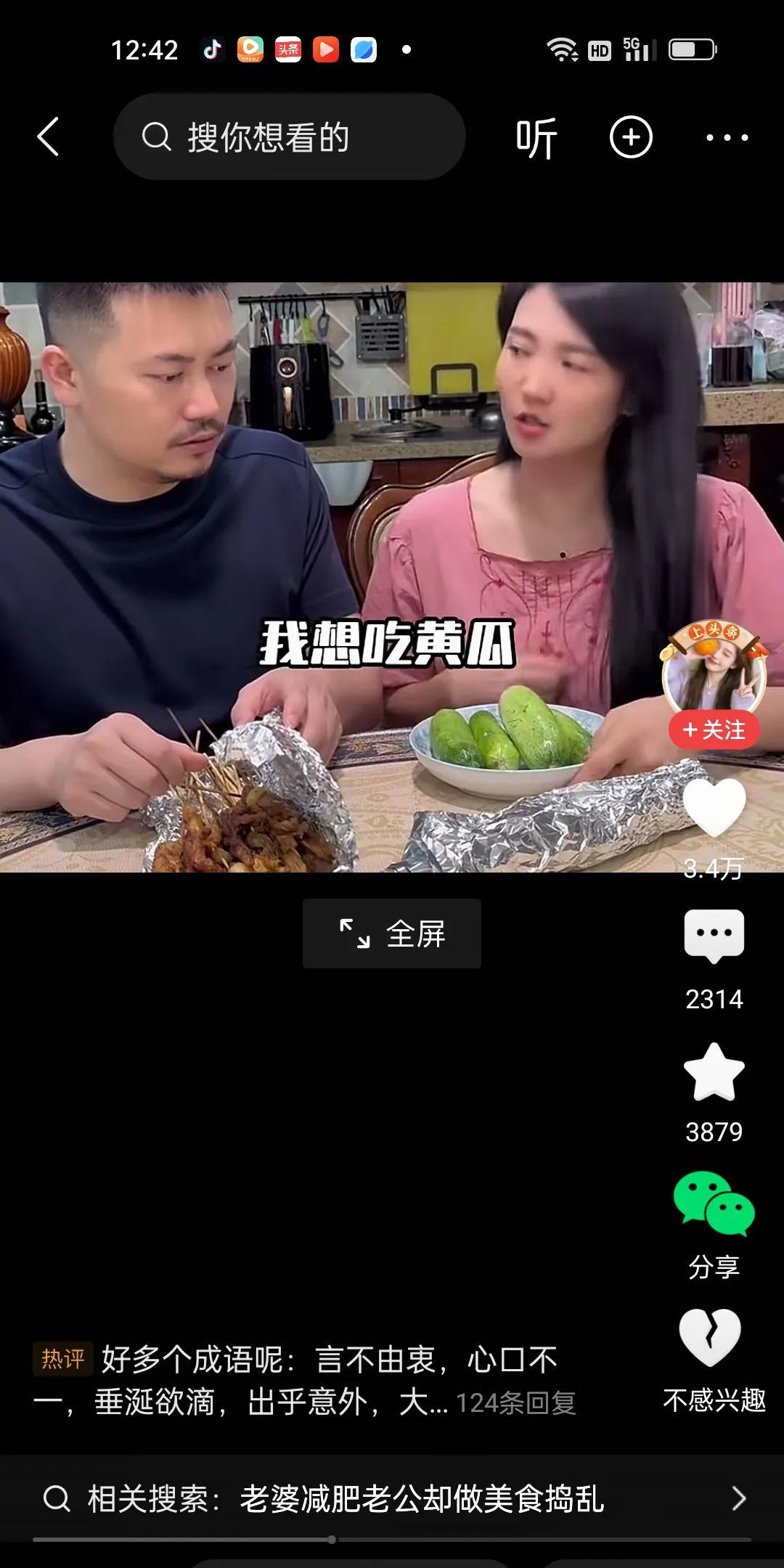 男人买了烧烤和黄瓜回家。女人埋怨说谁让你买烧烤的,我减肥,我要吃黄瓜。男人把黄瓜