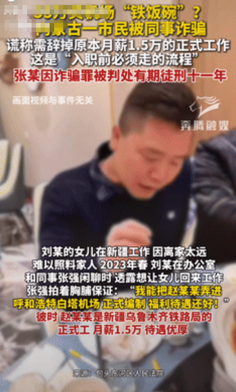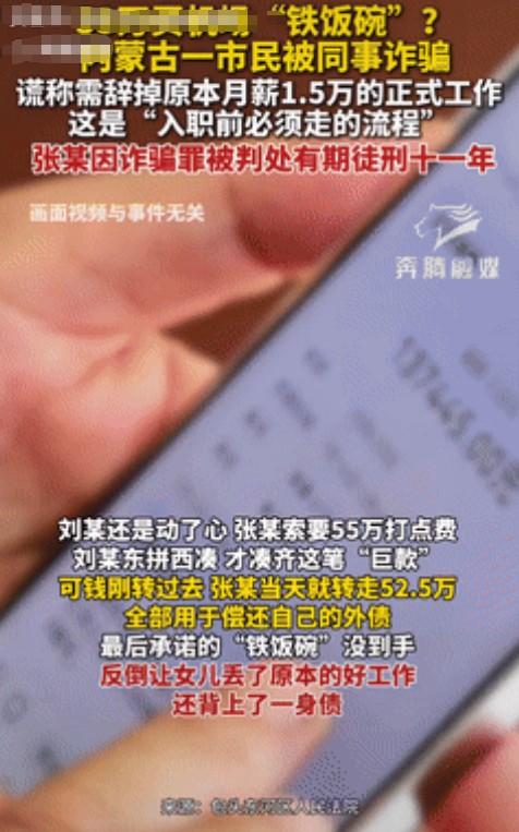 “肠子都悔青了!”内蒙古一男子因女儿工作离家远,难以照料家人,便轻信同事的话,让女儿离职,到同事安排的公司工作,但男子需缴纳55万打点费,男子东拼西凑把这笔“巨款”给到同事后,对方却拿走52.5万元,用来偿还自己的外债,网友:天上不会掉馅饼! 据奔腾融媒7月23日报道,女儿原本工作稳定,每月到手薪资就有上万元,公司待遇还好,这是多少人挤破头想拥有的工作,可男子却嫌弃离家远,不能时时刻刻看到女儿。 但女儿回家又没好的工作,于是他就给同事发牢骚,结果同事告诉他,自己有门路,能把他的孩子弄到机场工作,薪资待遇只会更好,听到这话的男子来了兴趣,让同事接着讲。 同事声称孩子面试前,必须将原来的工资给辞了,而且走后门需要一定资金,男子理解同事的意思,于是让他说个数,得知金额的男子,根本拿不出那么多钱。 可既然是自己让女儿回来,他就得找个更好的工作,不然女儿怎么可能会听他的话,于是男子找亲朋友好借钱,能借的全借了,他把钱给同事后,让对方尽快给女儿安排入职。 对方满口答应,转头就把钱给私吞了,男子眼见女儿的工作迟迟没有着落,这才反应过来自己被骗了,报警后,确定了同事说的全是谎话,他压根就不认识机场的人,更别提介绍工作。 虽然同事最终被判了11年,可他借亲戚的钱还得还,女儿得自己找工作,明明有着美好的未来,却因为男子一己私欲断送了。 对于这件事情,大家有什么看法? 信息来源:奔腾融媒 2025年7月23日