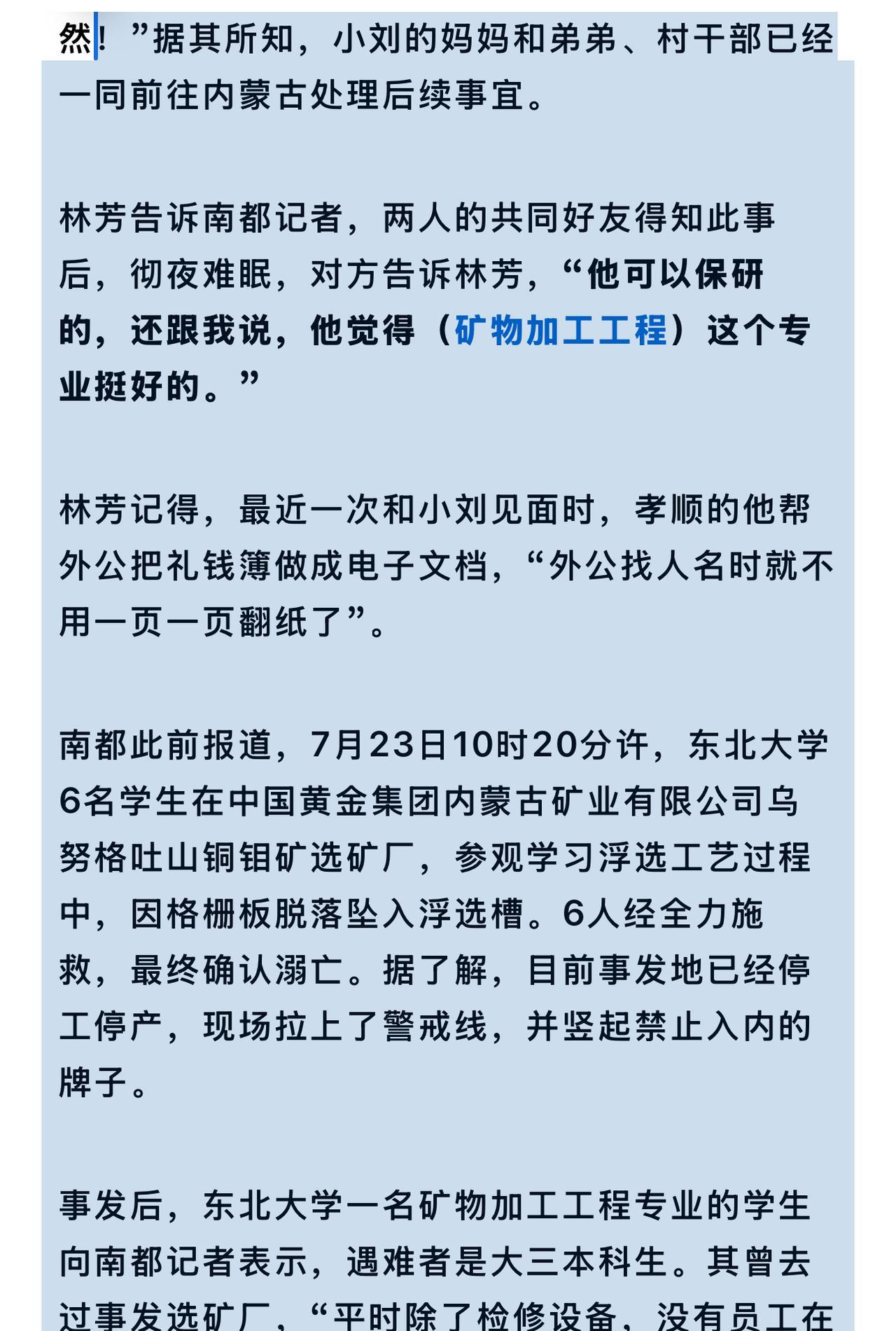 有律师说,坠亡浮选槽的6名学生,按内蒙古当地经济水平,最多每人赔偿100多万。 大家觉得如何呢? 昨天,坠亡浮选槽的其中一名学生小刘,其好友林芳(化名)难掩悲痛,介绍了小刘家的情况。 小刘1.8米,挺帅的,还保研了,他经常笑嘻嘻让人给他介绍女朋友,性格乐观幽默。 有一张照片,是小刘穿着白衬衣,站在东北大学的讲台上发言,他身形偏瘦,腰杆笔直,神采奕奕。 小刘出生在重庆市巫溪县农村,家境很一般,还有一个弟弟在读高中,所以家庭经济压力大,他自己则需要申请助学贷款上学。 平时,小刘回家还帮爸爸妈妈干农活,寒暑假会去做家教,自己赚取生活费,乐得外婆直夸:“以后都不用给生活费了!” 查了下,东北大学的保研率只有20%左右,小刘能保研,说明他勤奋上进,成绩优秀,学习、做家教两不误,算是非常励志了,不像一些学生整天打游戏,不思进取,或者目标缺失,选择躺平,感到人生迷茫,不知所措。 据好友介绍,小刘在社交媒体的头像是周星驰的侧脸,可见他生性乐观幽默,有些搞笑色彩,虽然家境贫穷,学生生活也比较单调,但他尽量把苦逼的日子调得有滋有味。 可惜了,这么一个品学兼优、生性乐观的小伙子,才20来岁,他对自己未来美好的憧憬,家人对他的殷殷期盼,都在一次实习参观,坠入浮选槽的意外事故中戛然而止,令人惋叹! [祈祷][祈祷]
