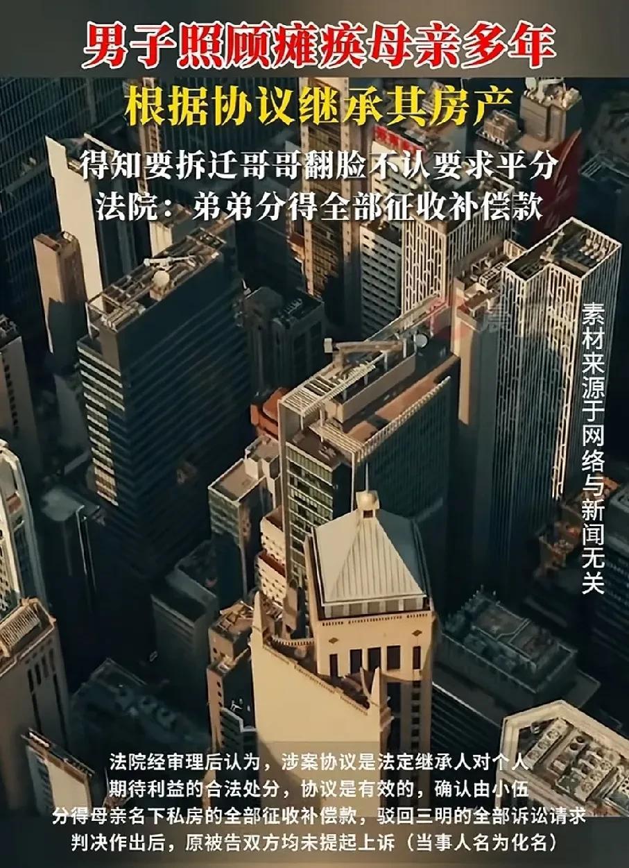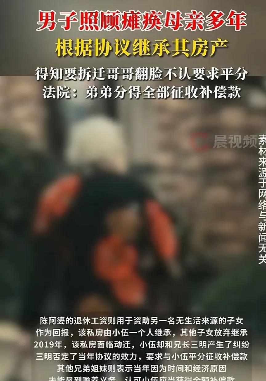 上海,男子精心伺候瘫痪母亲5年,母亲在的时候,兄妹5人签下协议,谁照顾老人,老人的一间私房归谁。20年后房子拆迁,男子拿到了补偿款。岂料,三哥眼红,跳出来要求平分。男子不同意:当初伺候老妈,你怎么不跳出来?三哥告上法庭,诉求当年的协议无效,法院判决亮了! 7月18日,潇湘晨.报晨视频报道,20年前,陈阿婆的5个子女,经协商后,签了一份协议。 由五弟一个人照顾母亲,期间,所有费用都由五弟一人承担。 作为回报,母亲的一间私房由五弟继承,其他子女声明放弃并签字。 陈阿婆生育了5个儿女,含辛茹苦养大了他们,又给5个孩子成家立业。 本该享清福了,不料,陈阿婆却患上了疾 病。 虽然5个子女都很孝顺,求医问药给母亲治疗,可最终陈阿婆还是瘫痪在床,从此与外面的世界几乎隔绝。 而当时5个子女都上着班,还都拖家带口,无法脱身,而老妈却急需人贴身24小时照顾,不能离人。 老人又很固执,不让请保姆,说隔壁的老姐妹,被保姆天天欺负。 5个子女愿意听老妈的安排,她说让谁伺候,谁必须听话照做。 老妈说:我和老儿子小五子最亲,就想让他伺候我。 小五子从小受母亲的疼爱,一口答应了:老妈交给我了,我最懂咱妈的脾气,保证把她照顾的乐呵呵的,不出半点差错。 其他4个子女一听,五弟愿意照顾老妈,正好顺水推舟,都同意了。 别看老太太年龄大了,可一点不糊涂,小五子照顾我可以,你们什么都不用管,但是,话要说到明面上。 小五子照顾我,所有的费用你们都不用管,包括日常生活花费、生病住院、平时的医药费、还有百年以后的丧葬费,都由小五子一人承担。 三儿子跳出来说:您说的好听,您不还有退休工资吗?那可比我们的工资都要高,还不都贴给小五子? 陈阿婆有自己的安排,5个子女中,有一个孩子无生活来源,身体还不好,自己的退休工资要贴补那个孩子。 老妈做事公正,大家对这个安排表示认可,其他人都不争。 陈阿婆当时就说:趁所有的人都在场,正好立个协议,你们都签字画押,别到时候说不清。 协议按照陈阿婆的意思:自己去世后,名下的一间私房,由小儿子继承,其他子女签字确认放弃。 事情办妥后,小五子就搬过来和老妈同住,照顾老人的一日三餐、生活起居,其他几个兄弟姐妹,也乐的该干嘛干嘛了。 要说小五子也真是个好儿子,老太太瘫在床上,吃喝拉撒,都由他亲自照顾。 把老人伺候的舒舒服服,每天乐呵呵的,不用哥姐们操心劳神。 小五子伺候了老妈整整5年,陈阿婆体面的离世,后事也都由小五子一人承担,没用哥哥姐姐们一分一毫。 老人的那一间私房,就归小五子了,别人也没有怨言。 事情在2019年出现了转折,那间私房要拆迁! 在寸土寸金的上海,别看只有一间面积不大的房子,那笔补偿款,却非常可观。 金钱面前,难免有人动了心。 阿婆的三儿子跳出来了,他认为,这么一大笔钱,凭啥归小五子一人所有? 房子是老妈的,老妈是5个人的妈,这笔钱应当5人平分。 其他人一听都摇头:咱可是当着老妈的面,在协议上签了字的。 都是一个妈生的,老妈不在了,咱们可不能当面一套,背后一套啊。 老三不屑的说:老妈都不在了,那张协议就是一张废纸。 其他兄妹劝说多次,老三不听,坚持要分补偿款。 其他兄妹对小五子说,当年我们都没有时间和精力照顾老妈,也没尽赡养义务,补偿款一分不要。 老三不听:不要正好!这笔钱他可以和小五子两人平分了。 三哥把五弟告上法庭,要求平分补偿款。 法院经过审理后认为,协议有效,不能让尽孝者流汗又流泪! 那么,从法律的角度来分析,如何看待这件事呢? 《民法典》第1158条:自然人可以与继承人以外的组织或者个人签订遗赠扶养协议。按照协议,该组织或者个人承担该自然人生养死葬的义务,享有受遗赠的权利。 本案中,陈阿婆与五儿子签订的协议,约定由他负责照顾并承担全部费用,母亲去世后房产归五儿子所有。 尽管小五是法定继承人,但法律并未禁止继承人,与被继承人签订遗赠扶养协议。 协议内容明确、形式合法,且小五实际履行了赡养义务,符合遗赠扶养协议的构成要件。 因此,协议合法有效,小五有权,依据协议取得房产及拆迁补偿款。 《民法典》第1130条:同一顺序继承人继承遗产的份额,一般应当均等。 有扶养能力和有扶养条件的继承人,不尽扶养义务的,分配遗产时,应当不分或者少分。 若没有协议,房产应按法定继承由五子女均分。 但本案中协议已明确约定房产归属,且其他子女签字放弃继承权,因此协议优先于法定继承。 三儿子在母亲患病期间,未履行赡养义务,反而在拆迁后主张平分补偿款。 根据上述条款,有扶养能力却不尽义务的继承人,应当少分或不分遗产。 最终,法院依法驳回陈阿婆三儿子的全部诉讼请求。 体现了对尽孝者的保护,和对“躺拿遗产”行为的否定。 对此你怎么看?