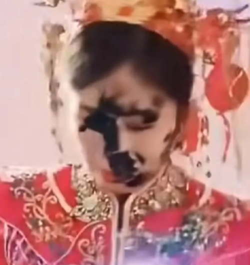 新娘的脸和脖子立刻被墨汁染黑,精心打扮了几个小时的秀禾服也被溅上了几块明显的黑斑,一时间从原本的喜庆氛围,变成了混乱和难堪。