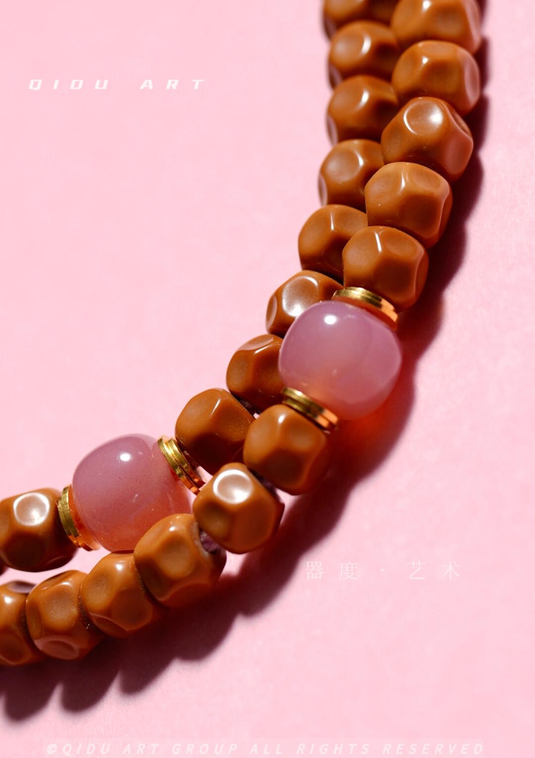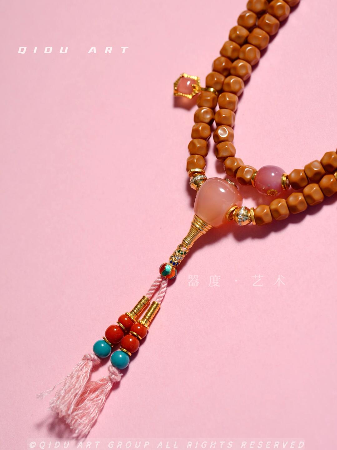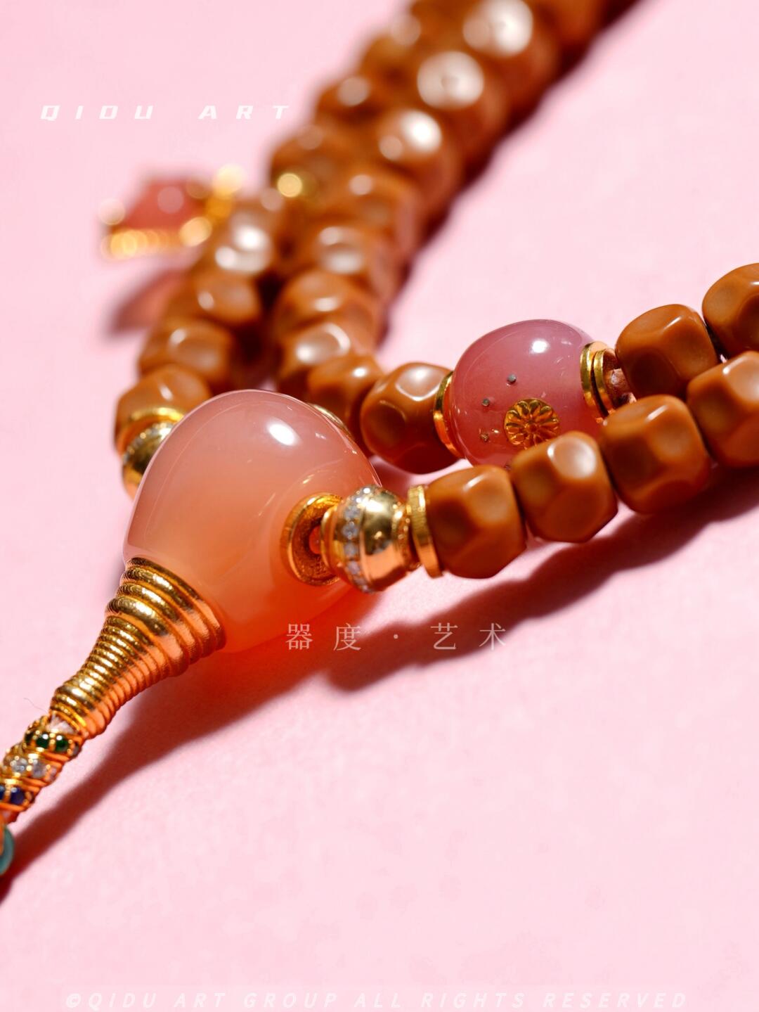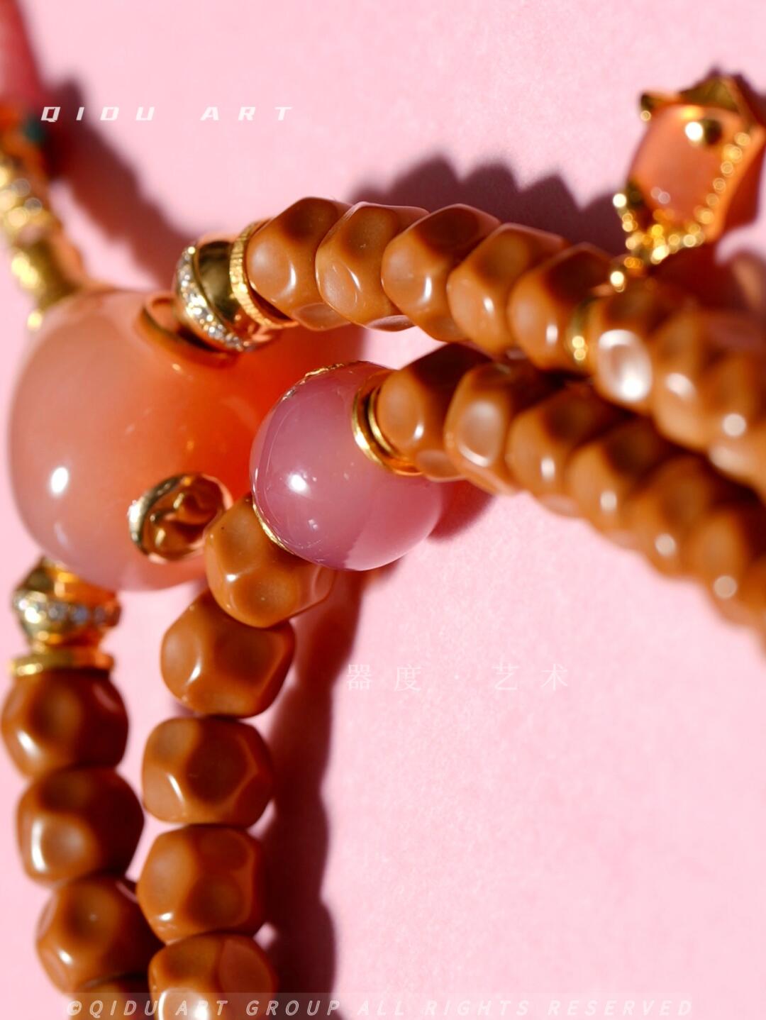 不爱盘串的人都会被这一套冒粉色泡泡的核尖勾引到[棒R]全套配饰以粉色调和金色为主配色,甚至用的线材都是配套的粉嘟嘟[氛围感R] 「主体」——核尖无相6.1mm ⬣ 优选野生老挝料,油性密度包优秀 ⬣ 精工手作细雕刻,打磨抛光要到位 「搭配」 [氛围感R] 材质—— 粉糯顶珠 粉糯腰珠 粉糯三通 粉糯卡子,定制的意义在此刻具象化。佛塔和卡子的黄金镶嵌都是专门开模定制。 [氛围感R] 配色——粉金两种主色调的搭配非常有MiuMiu风,粉糯的明度饱和度轻松拿捏了明亮又柔和的老钱感。