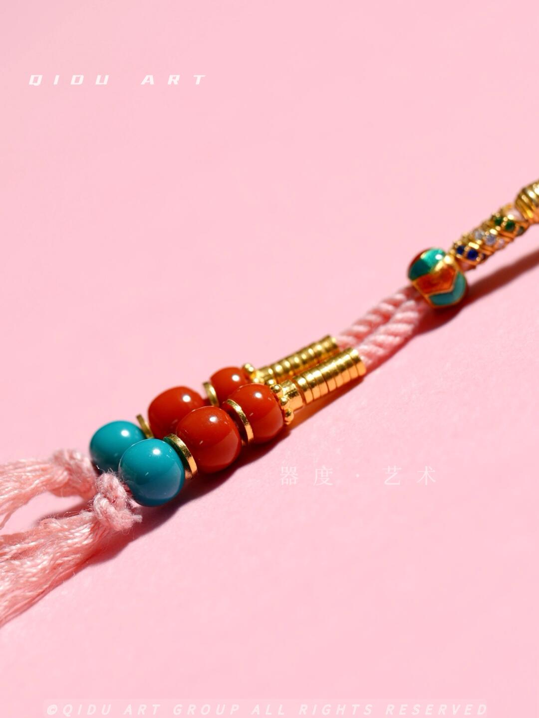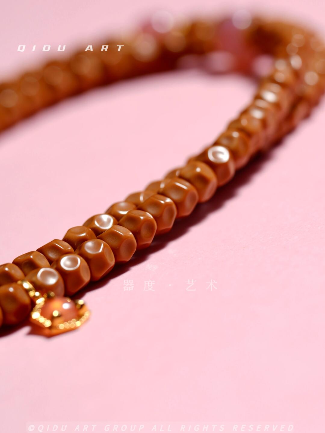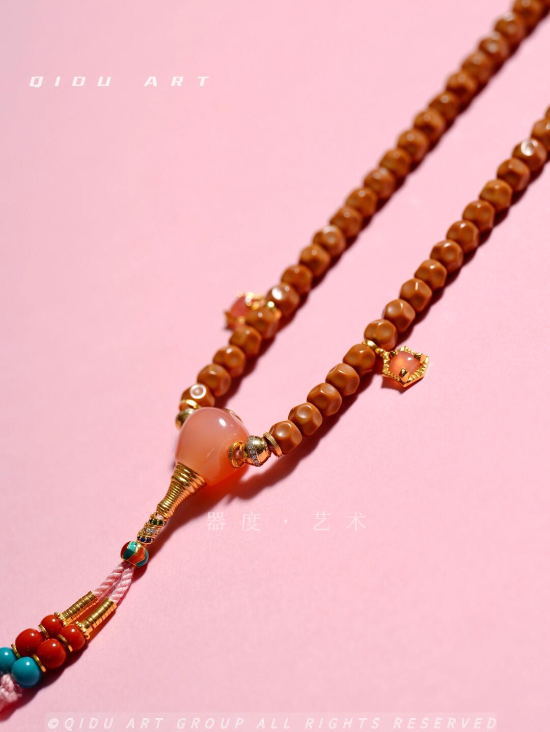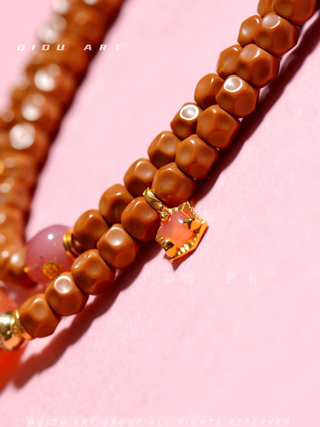 不爱盘串的人都会被这一套冒粉色泡泡的核尖勾引到[棒R]全套配饰以粉色调和金色为主配色,甚至用的线材都是配套的粉嘟嘟[氛围感R] 「主体」——核尖无相6.1mm ⬣ 优选野生老挝料,油性密度包优秀 ⬣ 精工手作细雕刻,打磨抛光要到位 「搭配」 [氛围感R] 材质—— 粉糯顶珠 粉糯腰珠 粉糯三通 粉糯卡子,定制的意义在此刻具象化。佛塔和卡子的黄金镶嵌都是专门开模定制。 [氛围感R] 配色——粉金两种主色调的搭配非常有MiuMiu风,粉糯的明度饱和度轻松拿捏了明亮又柔和的老钱感。
