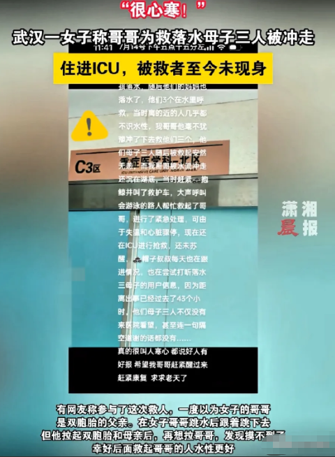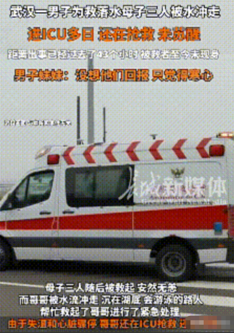 武汉,一男子为救落水的母子三人,跳下水将全部人救出,自己却被水流冲走,最终命大被人捞起,但由于失温和心搏骤停仍在ICU抢救,被救母子迟迟未曾露面,甚至没有一句问候,一个谢字。