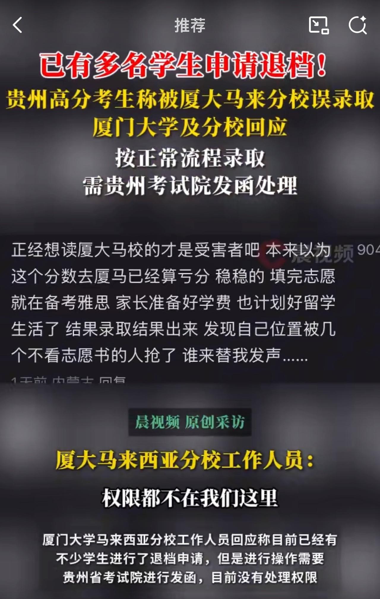 也就说本以为是被厦门大学本部录取,没想到最后被录取到了厦门大学马来西亚校区。目前,该考生声称,这里面有自己的原因,但系统未明确区分分校是罪责所在。目前已经联系好了复读学校,准备明年再次参加高考。 此事情在网上曝光之后,迅速发酵。有网友当即表示,“在一个统计网站看到厦门大学马来西亚分校分那么高,还挺纳闷的,原来是玩了个陷阱。除非是当地华人,不然谁高分跑去那边读厦门大学的分校。这得给学生一个说法,不能白白耽误了人家至少一年!” 针对这个情况,有记者致电厦门大学招生办,该工作人员表示,学校将严格按照志愿录取流程进行正常录取。 而厦门大学马来西亚分校工作人员回应,称“目前已经有不少学生进行了退档申请,但是进行操作需要贵州省考试院进行发函,目前没有处理权限!” 周少想说这事儿听着就揪心。609分不算低了,本想奔着好学校去,结果因为志愿系统没标清楚“马来西亚分校”,导致稀里糊涂报了个每年学费10万的专业,还成了沉重负担,换谁都得急坏,最终无奈只能选择复读。 考生自己固然有核对疏漏,但志愿系统未明确标注“马来西亚分校”确实说不过去。高校在专业编号旁加个括号备注,就能避免这个问题了。 而且,分校和本部差远了,学费、地点都不一样,就该明明白白标出来,哪能让人猜呢?现在考生只能复读,一年功夫就这么耽误了。 其实报志愿时这种“坑”可能不少,而且类似“本部与分校混编”的志愿陷阱并非个例,不少高校的异地校区、中外合作项目在志愿系统中标识模糊,每年都有学生因此栽跟头。周少真心希望相关部门重视起来,莫让这种现象继续持续出现。 对于这位高考609分被厦门大学马来西亚分校录取,大家怎么看么?如果是你遇到这种情况,会选择复读还是咬牙就读?#寻美三湘# #长沙新朋友#
