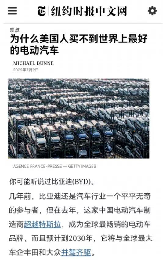 比亚迪超越特斯拉,登顶全球纯电销冠!🚗⚡ 2025年上半年,比亚迪以102万辆纯电销量力压特斯拉(72万辆),成为全球新能源车霸主!中国比亚迪的销量已经是特斯拉的5.4倍,而且在海外市场的表现同样亮眼,今年上半年,比亚迪销量突破47万辆,同比暴涨130%,在意大利、西班牙、泰国等市场超越特斯拉。 比亚迪能够超越特斯拉,主要依靠的是以下三点: ✅ 技术领先:刀片电池、DM-i混动等黑科技 ✅ 产品多元:覆盖各价位,满足多样化需求 ✅ 出海战略:本地化生产+全球112国布局 对此美国纽约时报认为,中国已取代底特律,成为世界汽车工业新中心!🇨🇳 比亚迪完全已经可以与丰田、大众比肩,展现出中国制造的全球竞争力。 比亚迪 #新能源汽车 #中国智造 #特斯拉 #全球销冠