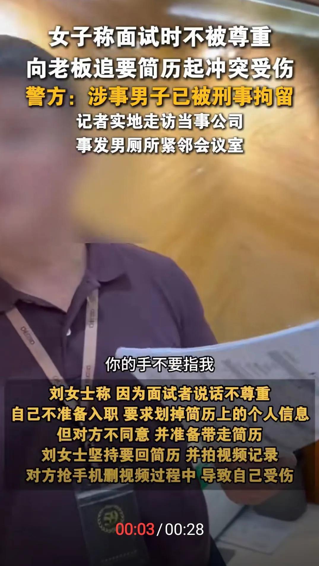 “太嚣张了!”广东深圳,一女子到一服装企业去面试,面试过程中,面试官很不尊重人,面试结束后,女子觉得自己不会入职这家公司,便要求对方销毁自己的简历,不料被打到骨折! 女子提出拿回简历的要求后,面试官不肯归还,拿着简历出了会议室,女子跟了上去,一会儿后对方突然打开了一个门,女子以为是会议室便跟了进去,谁知是男厕所。 在男厕所内女子遭到多人殴打,面试官一手从后面搂住她的脖子,一手击打她的嘴巴和脸,女子被打后,眼前一黑,手机都被打掉了。 最后警察来了后,女子才拿回手机,拨打了120去医院验伤,诊断结果显示女子被打到骨折。 看到女子的遭遇,该公司的前员工也站出来指控老板,表示自己在职时也被打了,手臂被打到淤青。 目前,打人者已被刑事拘留。 女子不打算入职,要回自己的简历,这样的要求无可厚非,即便企业不愿意归还,也可以好好沟通解释,严格为求职者信息保密,动手打人就过分了。 面试是双方互相了解的一个机会,面试官一言一行都代表公司形象,不应高人一等,应尊重面试者!