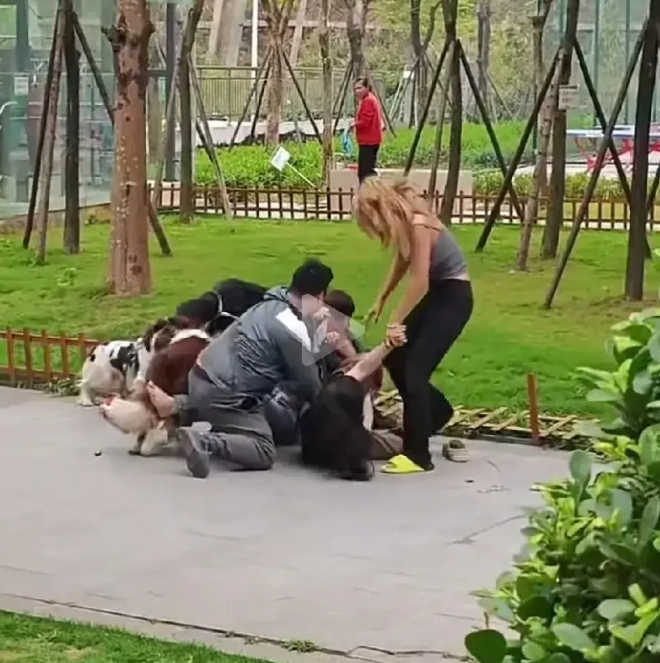 又是一起遛狗引发的打架事件,似乎也都牵了绳子,还是狗咬狗,人打人,闹得不可开交,