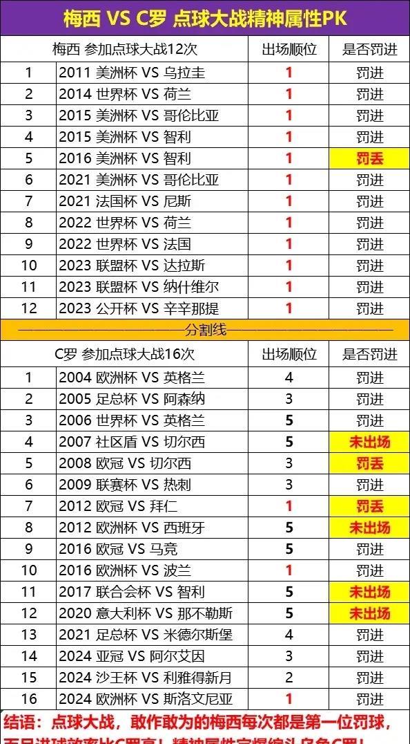 C罗:有些球员害怕踢点球而我不怕,丢了一次两次我就去踢第三次。 如果是指常规时间,罗哥这话可能没啥问题,不然也不会有空前绝后的174个点球。 如果是指点球大战,罗哥这话就大有问题了。他职业生涯参加了17次点球大战,顺位次数如下: 1.第五顺位(6次) 2.第三顺位(4次) 3.第一顺位(4次) 4.第四顺位(2次) 5.第二顺位(1次) 堂堂的球队核心与精神领袖,第一顺位才区区4次,而第五顺位多达6次,以至于其中有4次都未能出场,赢了就摘果,输了就卸责,如意算盘噼里啪啦响。 24年欧洲杯,C罗在对阵斯洛文尼亚的常规时间内罚丢点球,哭的稀里哗啦,队友们轮流当爹安慰他。 进入点球决胜,C罗第一顺位罚进点球,罗粉借机营销“罗哥自我救赎”。其实这完全是形势所迫,才不得不如此,毕竟是因为你的失点,球队未能在常规时间赢球,才进入了点球大战,这时候你还往后躲实在说不过去。他上一次第一顺位已经是2016年了。之后对法国的点球大战,也是同样的逻辑,是为了弥补常规时间的失点,而非梅西那样总是第一个站出来的常规操作。 C罗,欺世盗名之徒,精致的利己主义者。