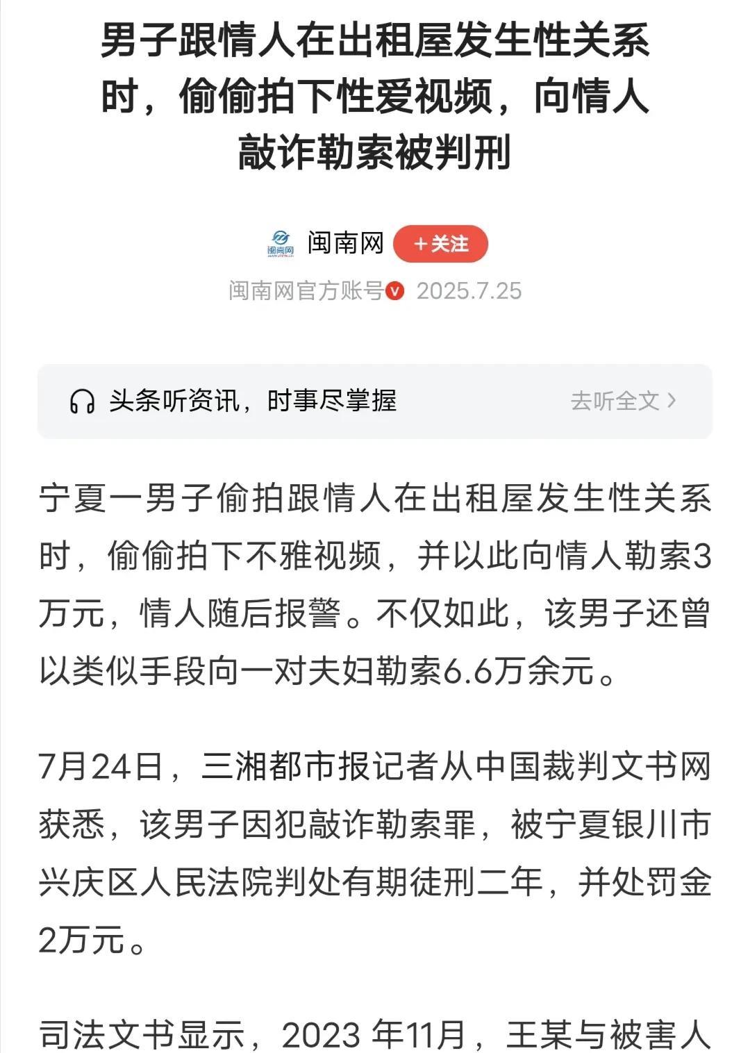 不讲武德!宁夏银川,男子在出租屋安了摄像头,带女友回来发 生 关系,偷拍下不雅视频,之后,女友要分手,男子拿出视频威胁,要发小区物业群里,还索要3万,女友气急报警,却发现男子干了一件更坏的事,这下可“刑”了。 7月25日闽南网报道,2024年8月,穆某想和男友王某分手,可是,他一提出分手,王某就拿出一段两人的不雅视频威胁她。 王某威胁穆某要是敢分手,他就把视频发在小区物业群里,不会让她好过,试图用这种卑鄙手段让穆某屈服。 更让穆某气愤的是,王某竟然问她索要3万元。 穆某羞愤难当,后悔不已。 两人的孽缘要从2023年11月说起,当时穆某认识了王某,一来二去,两人就互相产生了好感,渐渐的成了情 人关系。 可是,穆某怎么也没想到,谈个恋爱,王某竟然偷拍了两人发生关系的视频。 穆某在提分手时,才意识到自己遇人不淑,既然不能好聚好散,她也豁出去了,直接报警了。 之后,王某被抓。 原来,王某在出租屋里安装了摄像头,在两人翻云覆雨的时候,偷拍下了视频。 而穆某当时对此却一无所知,直到他提出分手才发现王某的真实面目。 王某做了这种事情,等待他的自然是法律的惩罚,可是,一查不要紧,王某不是第一次干这事了。 早在2023面12月,王某在网上认识了一对夫妻,他偷拍了人家夫妻俩的不雅视频,以此要挟,索要6.6万多元。 这对夫妻给他转了2万后,发现王某没有把视频删除,一怒之下报了警,之后,王某把钱退还给人家了。 有人说,情 人本身就是天赐的缘分,合得来就处,合不来就好聚好散,不能不讲武德。 这个男的不地道,吃着碗里的,还看着锅里的,最后连锅都端了了,你白嫖不打紧,还想要高薪报酬,太贪心了。 1、王某偷拍他人不雅视频,属于侵犯他人隐私权。 《民法典》第1032条规定:自然人享有隐私权。任何组织或者个人不得以刺探、侵扰、泄露、公开等方式侵害他人的隐私权。隐私是自然人的私人生活安宁和不愿为他人知晓的私密空间、私密活动、私密信息。 王某偷拍他人不雅视频的行为,严重侵犯了穆某、以及两夫妻的隐私权。 不雅视频涉及被害人的私密活动和私密信息,属于隐私范畴,王某未经对方同意,私自安装摄像头进行偷拍,违反了《民法典》中关于不得拍摄他人私密活动的规定。 2、王某问穆某、以及那对夫妻索要钱财,构成敲诈勒索。 《刑法》第274条规定:敲诈勒索公私财物,数额较大或者多次敲诈勒索的,处三年以下有期徒刑、拘役或者管制,并处或者单处罚金。 第一,主观方面:王某通过偷拍不雅视频,企图利用被害人害怕视频传播的心理,强行索取财物,以满足自己的私利。 第二,客观方面:王某实施了威胁行为,以要把不雅视频发到穆某小区物业群,想对穆某形成心理压力,迫使穆某交付财物,并且实际向穆某索要3万元,向另一对夫妻索要6.6万余元,总计9.6万,数额达到了法律规定的数额巨大标准。 第三,王某的行为侵犯了他人的人身权利,如隐私权、名誉权等。因此,王某的行为完全符合敲诈勒索罪的构成要件,构成敲诈勒索罪。 3、王某部分犯罪因意志以外原因,没有得逞,属于犯罪未遂。 《刑法》第23条规定:已经着手实行犯罪,由于犯罪分子意志以外的原因而未得逞的,是犯罪未遂。对于未遂犯,可以比照既遂犯从轻或者减轻处罚。 本案中,在王某敲诈勒索另一对夫妻的案件中,夫妻转账2万元后,发现王某没有删除视频,随即报警,王某最终退还钱款。 这意味着王某对该夫妇的敲诈勒索行为没有完全实现其非法占有6.6万余元财物的目的,属于犯罪未遂。 法律对于未遂犯规定,可以比照既遂犯从轻或者减轻处罚。 综上,法院判决:王某犯敲诈勒索罪,判处有期徒刑2年,并处罚金2万。 这件事也给大家提了个醒,不要轻易快速开启亲密关系。 穆某在与王某结识后,很快发展为情 人 关系,这种快速建立的关系通常缺乏足够的了解。 穆某没有意识到在出租屋里做不可描述的事时,可能会被偷拍,因此,缺乏对隐私保护的重视。 在与他人相处时,无论是恋爱还是其他关系,都要明确自己的隐私边界,不轻易在可能存在安全隐患的环境下进行私密活动。 在现实生活中,对于新结识的人,尤其是涉及情感方面的发展,要保持理性和谨慎。 当王某以将视频发到小区物业群相威胁,索要3万元时,穆某没有因为害怕视频泄露而盲目答应对方的要求,而是选择了报警,这是非常正确的做法。 最后,在面临类似的威胁时,要保持冷静,不要被对方的恐吓所吓倒,要明白,妥协往往只会让对方得寸进尺,进一步侵犯自己的权益,所以,一定要第一时间报警。 关注@福康说法 从日常点滴学法律,生活安稳更有底