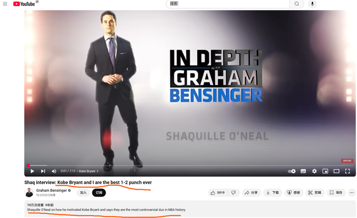 总公司层面一句话总结: But at the turn of the century, the pair would dominate the basketball world in a way few ever have. 2. 奥尼尔对科比的看法: 2.1 请看一段9年前的采访