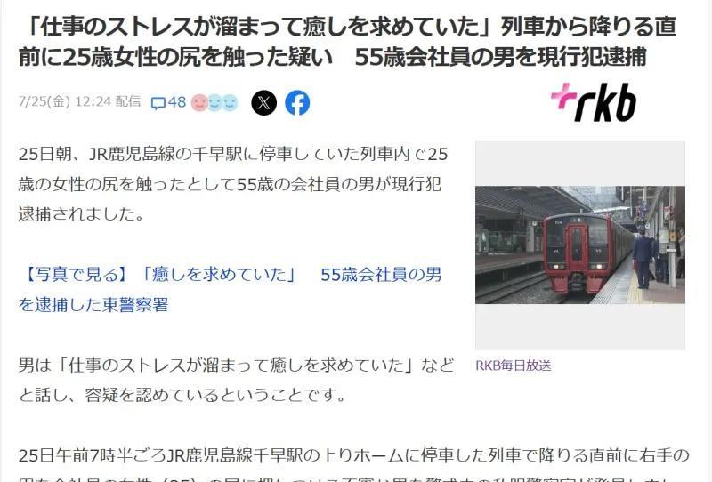 福冈男子早高峰下车前摸女子屁股被捕 7月25日上午,一55岁公司职员因在JR鹿児島線千早駅下车时摸一名25岁女子的屁股被当场逮捕。 男子说:“是因为我的工作压力太大了”。 7月25日上午7时30分左右,车内巡视的便衣警察盯上一名可疑男子,该男子在下车时用右手背压在一名年轻女子(25岁)的屁股上,此时电车在JR鹿儿岛线千早站上行站台到站。 便衣警察听到两人的对话时,确认该男子的违法行为,以涉嫌防骚扰条例(猥亵)罪名逮捕了他。 被捕男子是一名居住在福冈县春日市的 55 岁公司职员,他承认了警方指控,他说:“我确实摸了她屁股,她很生气着急“。警方正在调查这名男子相关的另一起猥亵案。