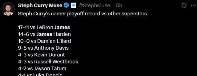 库里生涯季后赛对阵九大巨星,战绩9-0 库里詹姆斯可谓是场下是朋友,场上是竞争对手,库里季后赛对阵詹姆斯战绩是17胜11负 库里和哈登打季后赛次数也很多,打了20场季后赛,库里14胜哈登6负 利拉德季后赛遇到库里是最惨的,打了10场比赛,输了10场,战绩是10胜0负 库里和戴维斯打了14场比赛,战绩是9胜5负 库里和杜兰特,还有威少打了7场比赛,两人的战绩都是库里4胜,威少和杜兰特3负 库里对阵塔图姆季后赛是4胜2负 库里对阵约基奇和东契奇都是4胜1负 总结来说库里打这九大巨星,战绩那是9-0,没有一位球星在季后赛能胜库里4场的,詹姆斯当年要没有库里压制的那三年,恐怕詹姆斯手上都多了两个冠军戒指,成为了没有争议的历史第一人了吧?