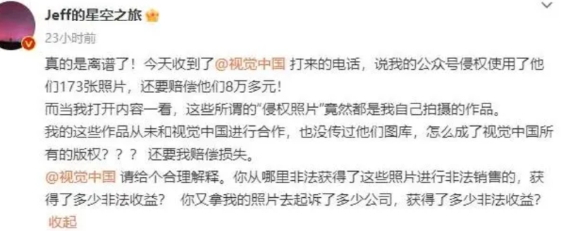 最近全网在抵制国足的赞助商,终于是让足协感到压力了! 怀着好奇心我登录足协官网,想看看有哪些赞助商。 好家伙,视觉中国居然也是赞助商之一! 这个视觉中国之前可是很虎很虎的: 把国徽和国旗挂自己网上收版权费, 连人民日报和共青团中央都点名了, 新浪游戏官方也发现自己的logo居然版权也是视觉中国的 未经摄影师同意,把摄影师173张照片挂自己网上,转头去找摄影师要8万多元版权费! 足协和视觉中国强强联合,必定是能让国足的海参之路继续辉煌下去的!