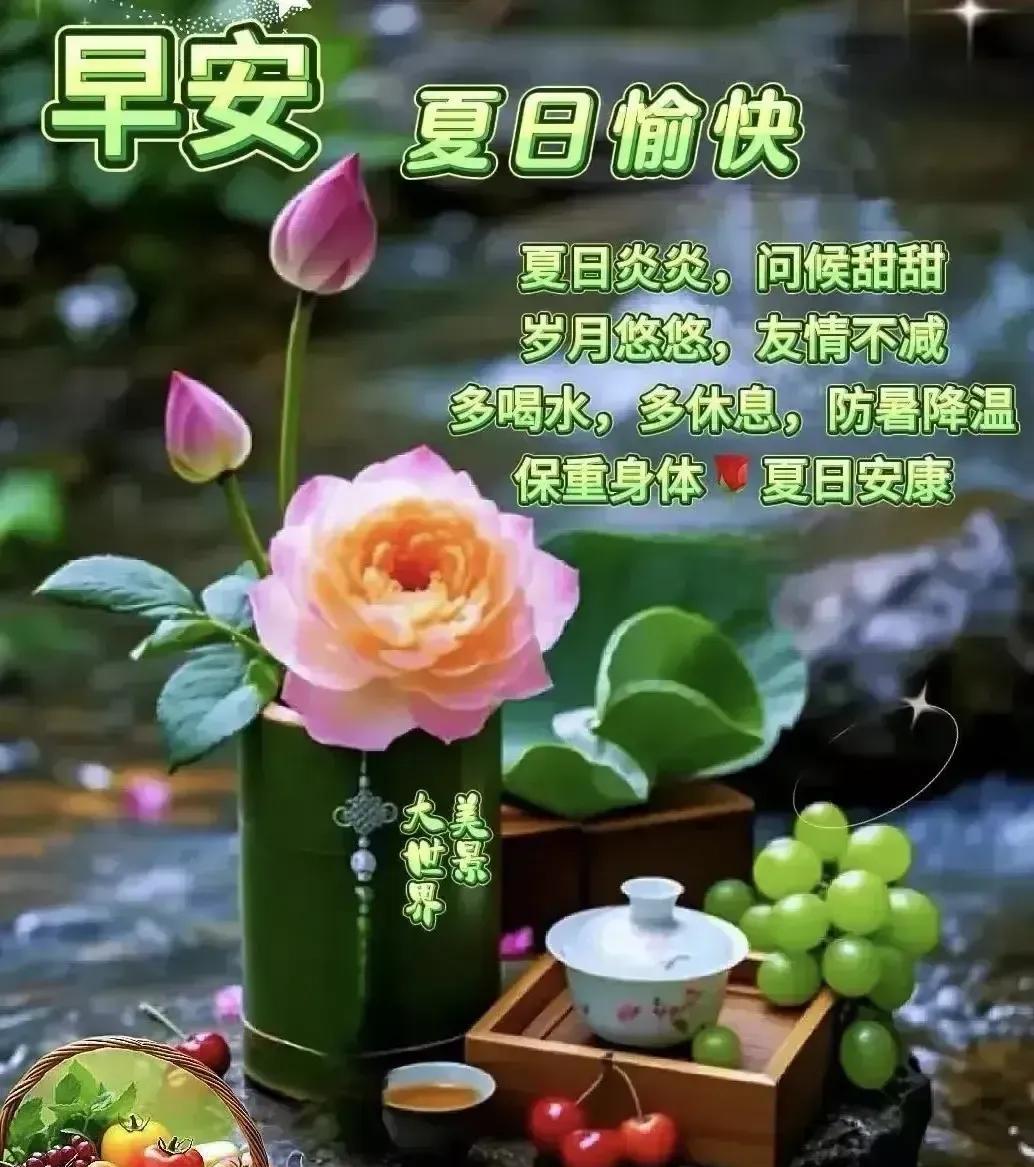 盛夏问候情意长 十里花香沁心房 碧叶连天似波涛 荷花朵朵展红妆 [玫瑰] 涓涓溪水静静流 但愿时光缓缓走 千山万水情意绵 深情厚谊心中留 [燃烧的心] 夏意浓郁暑气长 柳丝缕缕蝉鸣远 亭亭玉立菡萏红 清风吹拂送荷香 清晨向友问声好 开心快乐无烦恼 一帆风顺踏征程 成功路上传捷报 20250725①[玫瑰]