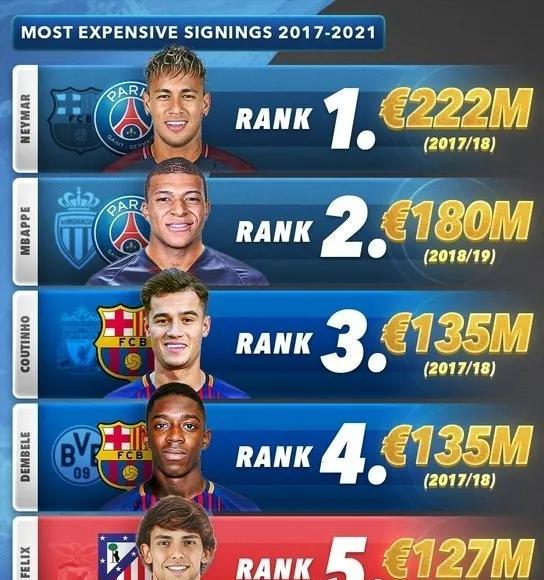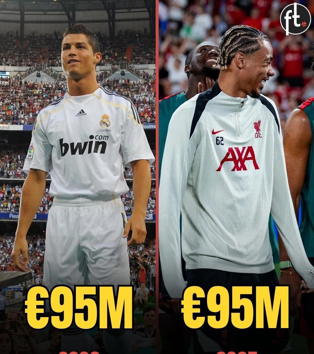 本世纪几个时间段内,各自最贵的5笔转会! 2000-2009年间,那时是皇马的银河战舰策略发威,最贵的大多去了皇马。尤其是2009年夏季转会窗口的签约,奠定了之后辉煌成就的基础。 2017-2021年间,则是换了石油爹的大巴黎开始实行巨星策略,高价引进了内马尔和姆巴佩,后面的发展大家都知道的,巨星≠成功。自姆巴佩离开之后,用平民取代巨星反而取得了成功,巴黎欧冠冠军首发阵容的总身价,只比他们2020年欧冠决赛时锋线三叉戟的身价多500万欧元。 2022年之后,基本就是英超一家独大,有钱也肯花钱,只是在欧冠赛场上效果并没有完全体现出来。 9500万,你能买到谁? 2009年,你可以买到C罗,如今就只能买到埃基蒂克这样的半成品。 像皇马这样的豪门,如今也不敢肆意花钱,只能通过自身影响力实施免签大法,科纳特、罗德里和萨利巴就是皇马下一步的免签目标。