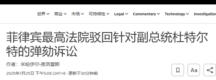 “杜特尔特阵营赢得重大胜利” 当全球舆论聚焦在泰国与柬埔寨的激烈冲突之时,菲律宾国内政坛却悄然迎来一场转折。杜特尔特家族在与现任总统小马科斯的政治较量中,取得了关键性进展。 据路透社7月25日报道,菲律宾最高法院当天全体法官一致裁定,针对副总统莎拉·杜特尔特的弹劾案违反宪法,决定予以驳回。外界普遍认为,这标志着杜特尔特阵营在法律层面上取得了重大胜利。 根据最高法院的解释,众议院为了推动莎拉下台,曾在去年12月2日、4日和19日三次提出弹劾案,今年2月又再次发起弹劾动议。这一连串行动被法院认定违反了菲律宾宪法中“同一官员在一年内不得多次被弹劾”的规定。 不过,这项裁决并不意味着莎拉·杜特尔特彻底摆脱了风险。一旦“弹劾冷却期”结束,众议院很可能重新发动新一轮弹劾程序。 与此同时,小马科斯方面也并非风平浪静。 目前,小马科斯的总统任期已过半,正准备发表他的第四次国情咨文。尽管部分民调数据显示他的支持率略有回升,但菲律宾媒体普遍认为公众对他三年来的执政表现并不满意。 正如菲媒评论指出,小马科斯上任以来“表现中规中矩,未达预期”,在应对通货膨胀、就业等关键民生议题上乏善可陈。尽管他在努力营造强硬领导形象,但实际执政成效却未能令民众信服。 随着杜特尔特阵营在司法层面站稳脚跟,菲律宾政坛的新一轮权力博弈或许才刚刚开始。