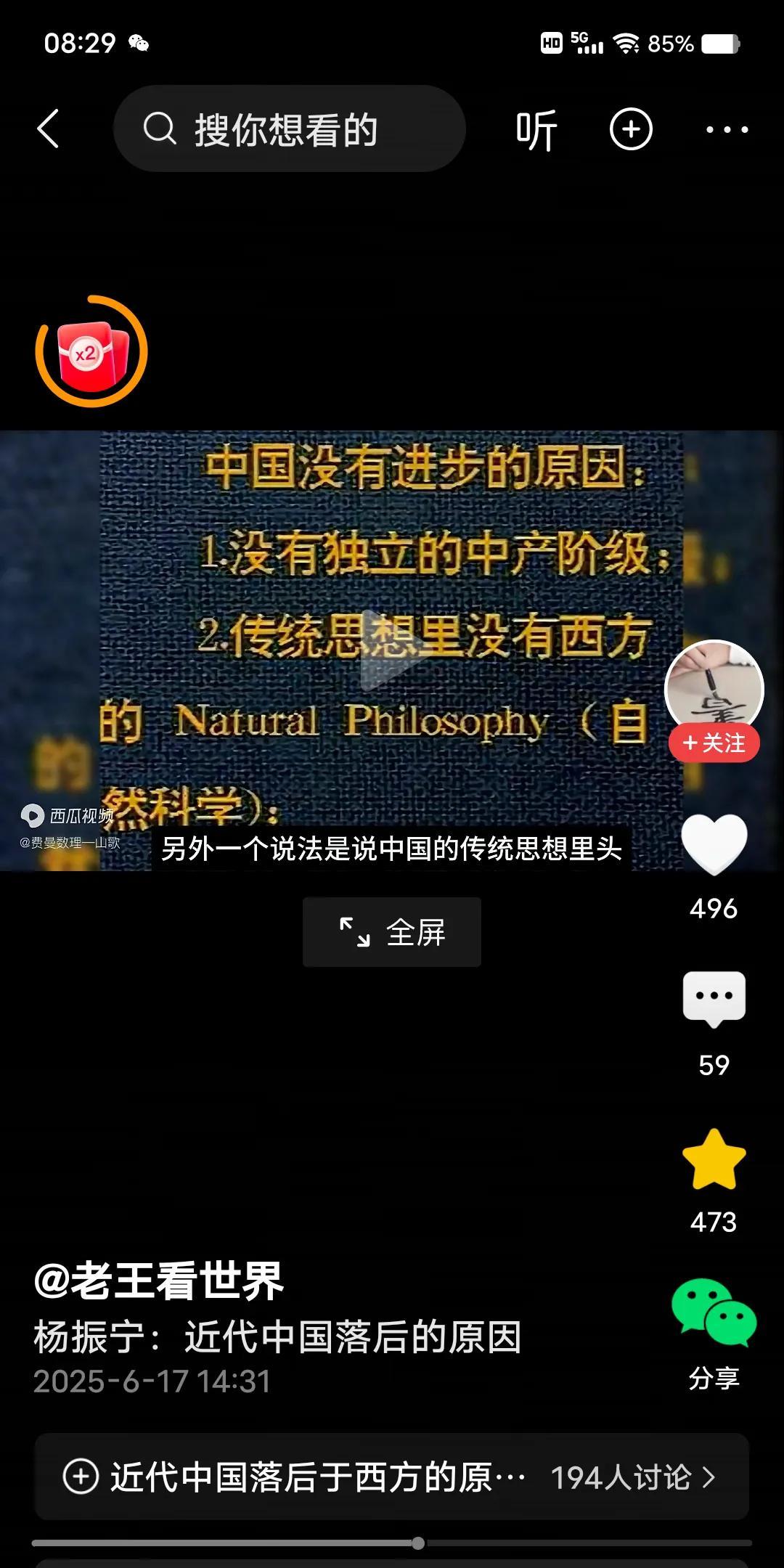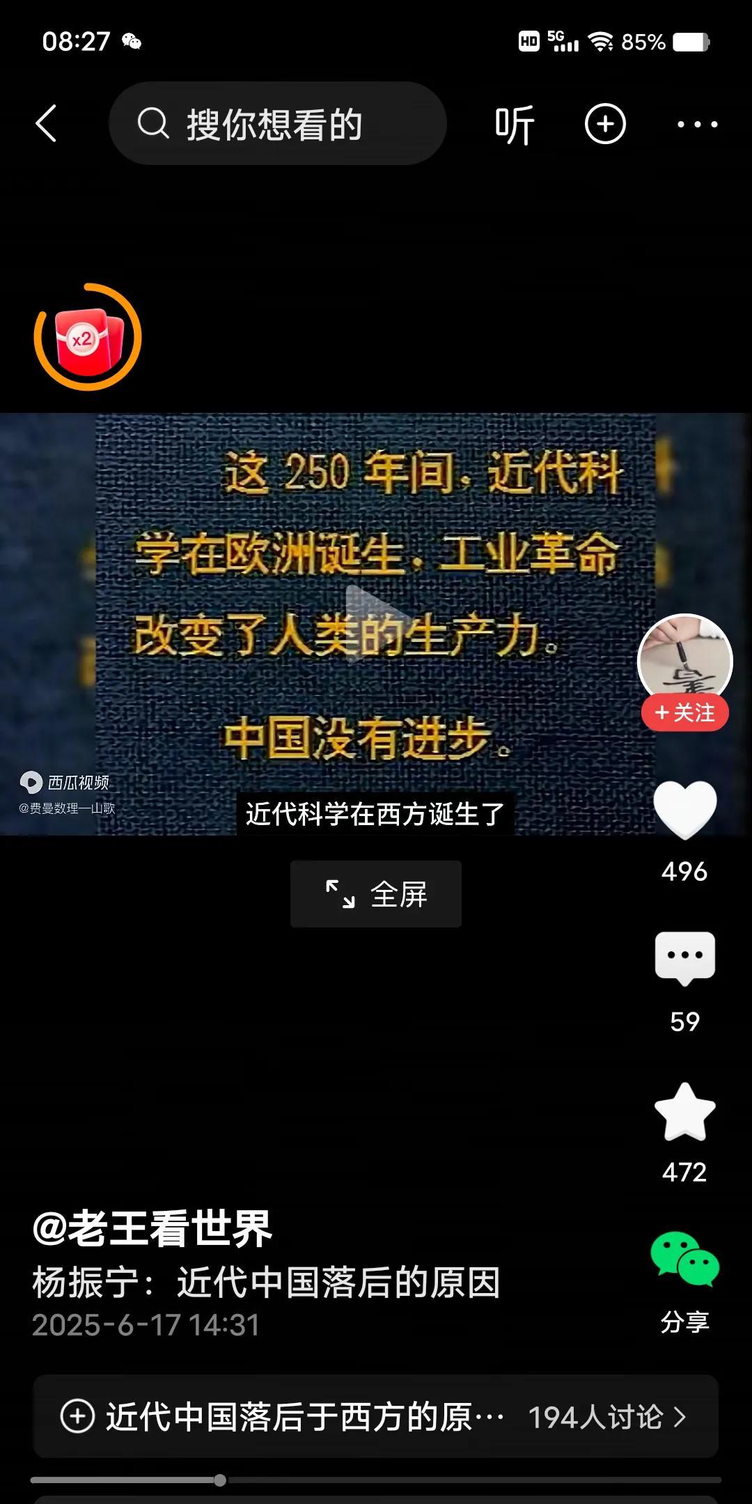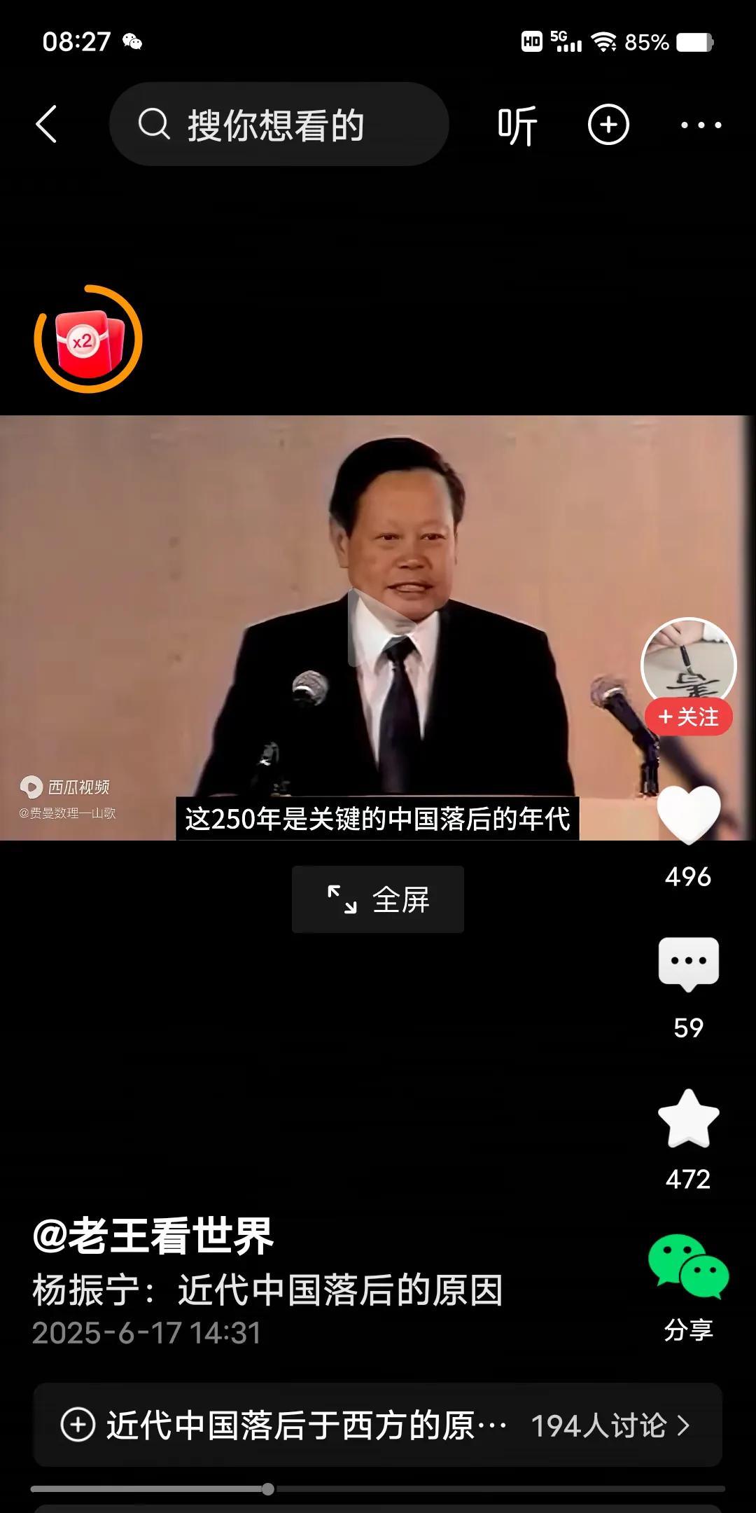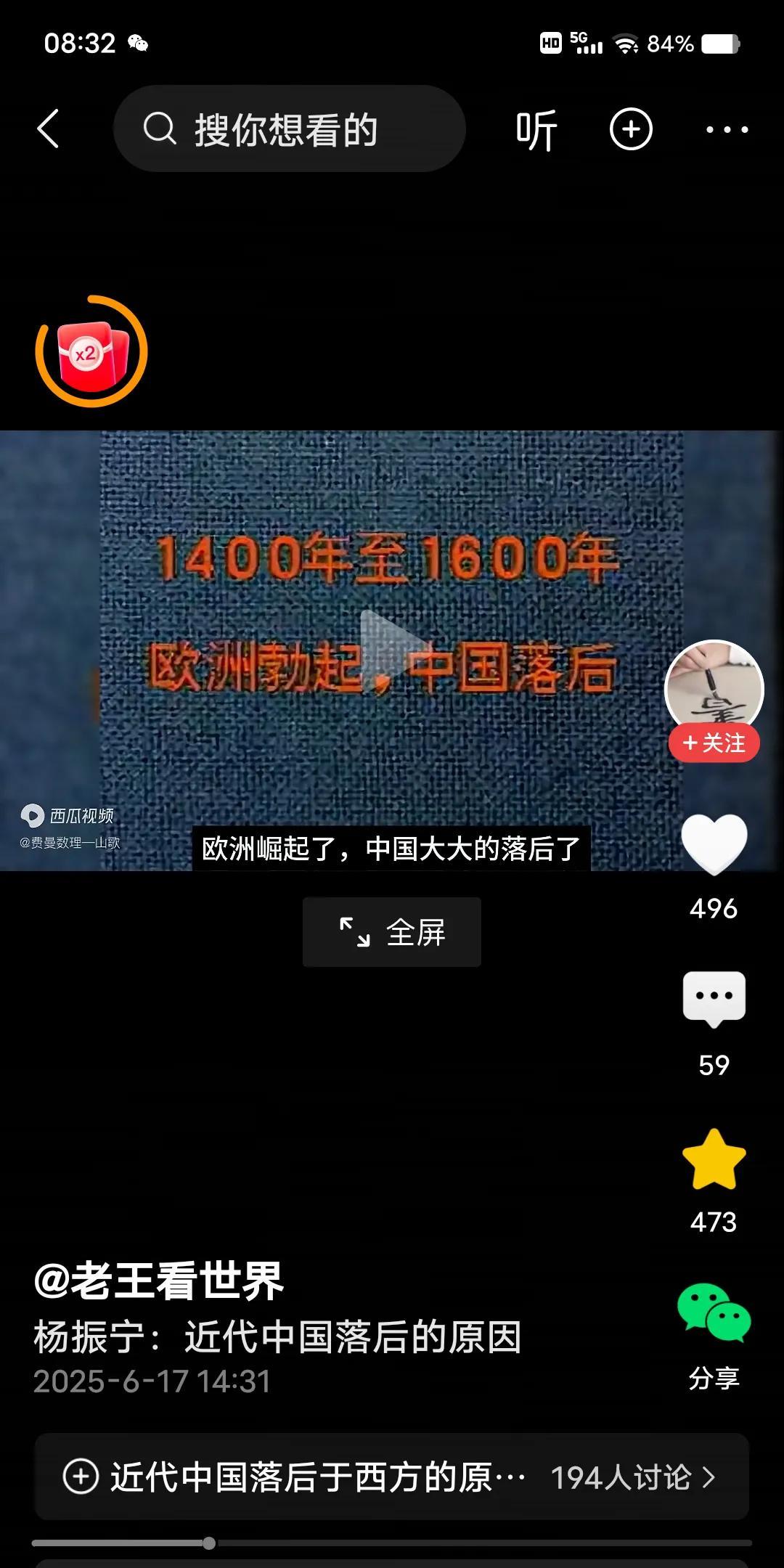 网上经常有人说,明朝是中国最强盛的朝代,中国的落后是从清朝始。满族人害怕汉人强大了管不了,就把汉人发明的科技都给毁掉了。 杨振宁先生不这么看。 杨振宁说在1400年之前,中国科技是领先于欧洲的。在与西方的交流中,中国的科技是向西方输出的,比如四大发明,对人类文明起了非常大的推动作用。 从1400年到1600年,这个250年是关键的中国的落后年代。这个年代正是明朝。西方迅速崛起,我们固步自封。我们是在明朝开始落后的,而不是从清朝开始。 杨振宁总结了四大落后原因。 第一是没有独立的中产阶级。 第二是传统思想里没有自然科学。 第三是科举制度。 第四是只重实用,没有严密的逻辑系统。