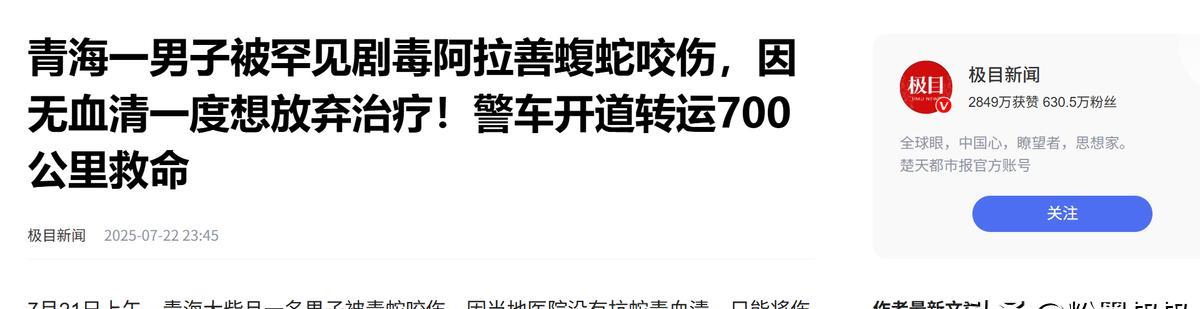“不幸中的万幸!”青海一40岁男子看到,罕见剧毒阿拉善蝮蛇出现在服务区后,准备将其抓获,放生野外,谁料,因操作不当,抓蛇过程中被蛇咬伤,得知当地没抗蛇毒血清,需到外地就医时,男子一度想放弃治疗,可民警的一番话,让他重燃希望! 青海大柴旦那边有个鱼卡服务区,戈壁滩上的歇脚点,平时车来车往的挺普通,前阵子这儿出了档子事跟一条蛇有关,听得人手心直冒汗。 有个 40 来岁的大哥姓李,那天在服务区歇脚,眼瞅着草丛里窜出来条蛇,那蛇看着就不一般,鳞片带点灰褐花纹,脑袋是三角形的,后来才知道这是阿拉善蝮蛇,稀罕又剧毒平时不常见。 李大哥也是热心,想着这蛇在服务区晃悠,万一咬了别人咋办?就想抓起来找个远点儿的野外放了,他没带啥工具,就凭着一股子蛮劲上手去抓,估计是没抓对地方,那蛇 “噌” 地回过头,照着他手指就咬了一口。 也就一两秒的事儿,手指尖立马传来一阵钻心的疼像被火烧似的,没等他反应过来,被咬的地方就红了,顺着手指往胳膊上肿,不一会儿整根手指就肿得跟发面馒头似的,颜色也变深了紫乎乎的。 旁边有人赶紧喊来服务区的人,七手八脚把他送到当地医院,医生一看伤口又认出那蛇是阿拉善蝮蛇,眉头就皱起来了:“这蛇毒烈得很,我们这儿没专门的抗蛇毒血清啊,得赶紧转去西宁的大医院那儿才有。” 一听这话李大哥心里就凉了半截,他问了问路程,从大柴旦到西宁,七百多公里路,全是戈壁公路,弯弯曲曲的,最快也得六七个小时。 再瞅瞅自己肿得越来越厉害的手,胳膊都开始发麻,他突然就泄了气,跟旁边陪着的民警说:“太远了,估计来不及了,不治了,别折腾了。” 民警一听就急了,蹲下来拍了拍他的肩膀,说:“大哥你别放弃啊!我们已经联系西宁那边了,医院都准备好了,血清也备着,只要咱们抓紧时间,肯定能赶上!你想想家里人,咱得拼一把!” 旁边的医生也跟着劝,说现在情况还能撑住,路上会一直盯着他的状况。 这些话像给李大哥打了针强心剂,他咬咬牙,点了点头:“行,听你们的,治!”很快救护车就来了,民警开着警车在前面引路,警笛一路没停。 戈壁上的路不好走,有些路段还在修,警车开道的时候,遇到堵车就停下来疏导,有段盘山公路堵得厉害,民警直接跑下车,往前跑了两公里硬是清出条道来。 救护车里医生护士一刻没闲着,隔会儿就量量血压,看看他的瞳孔,生怕路上出啥岔子,司机师傅也没敢歇,除了在服务区喝了口水,一路踩着油门往前赶,六个小时眼睛都没敢多眨,李大哥躺在车上,疼得直冒冷汗,但一想到民警说的 “家里人”,就咬着牙挺着。 下午五点多车终于到了西宁的省医院,急诊早就等着了,推着他直接进了抢救室,当抗蛇毒血清慢慢打进去,李大哥感觉胳膊上的麻劲儿渐渐退了,紧绷的身子才松下来,眼泪一下子就下来了,真是从鬼门关走了一遭。 后来医生说阿拉善蝮蛇的毒性特别强,再晚来半小时神仙也难救,现在李大哥还在医院养着,手慢慢消肿了,就是还得观察些日子,那条惹事的蛇也被送到西宁动物园了,有人专门照看。 这事儿发到网上,好多人都说这救援太给力了,但也有人念叨,这蛇多毒啊,普通人见了躲都来不及哪能上手抓?就算想放生,也该先报警让专业的来。 李大哥后来也后悔,说当时脑子一热就想上手,哪知道这么险,他总提民警那句话,说要不是那句 “想想家里人”,自己可能真就放弃了。 (信息来源:极目新闻——青海一男子被罕见剧毒阿拉善蝮蛇咬伤,因无血清一度想放弃治疗!警车开道转运700公里救命)