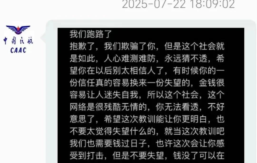 这是一家讲武德的骗子公司。 近日,小美接到“中国民航”工作人员的电话,称她购买的机票因飞机延误,可以领取400元的保险费,结果小美信以为真。 随后对方发给她一个“中国民用航空局”链接,在工作人员的指引下,让她在网站上下载易办APP。 其实,这是一款屏幕共享软件,在工作人员一阵忽悠下,又是输银行卡,又是刷脸,又输验证码,结果把自己钱转出去了6万元。 随后小美询问工作人员,怎么把自己卡里的钱划走了6万元。 对方也不藏着掖着:“我们跑路了,我们欺骗了你,这个社会就是如此,人心难测难防,希望你以后别太相信人了……,就当这一次买一个教训,我们也需要钱过日子,这件事可能会对你造成不小打击,但是不要灰心,钱没了可以再挣,在此对你说声对起。 不得不说,这是一家很讲武德的骗子公司,就好比小偷到你家里偷了东西后,叫你吸取教训一样,真是嚣张到了极点。
