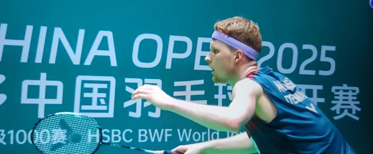 中国羽毛球公开赛男单比赛,安东森2:1战胜了大波波夫,晋级四强。 前