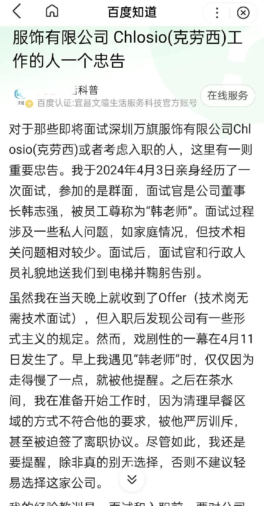 真是不查不知道啊!殴打面试女孩致骨折的深圳万旗服饰的老板韩志强在网上被曝光的恶行随便一搜就一大堆。简直是个变态管理公司! 从来没见过一个企业老板能在网上有那么多负面丑闻的,也不知道这个人在深圳这座文明城市为什么能如此肆无忌惮犯那么多事还安然无恙。 最恶心的是面试女孩被韩志强骗到厕所打得腰椎骨折了,但万旗服饰公司方还说无耻的说双方没身体接触。