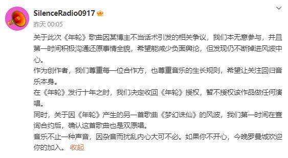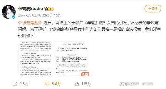 【#张碧晨不会再唱年轮#】25日,张碧晨工作室@张碧晨Studio就《年轮》