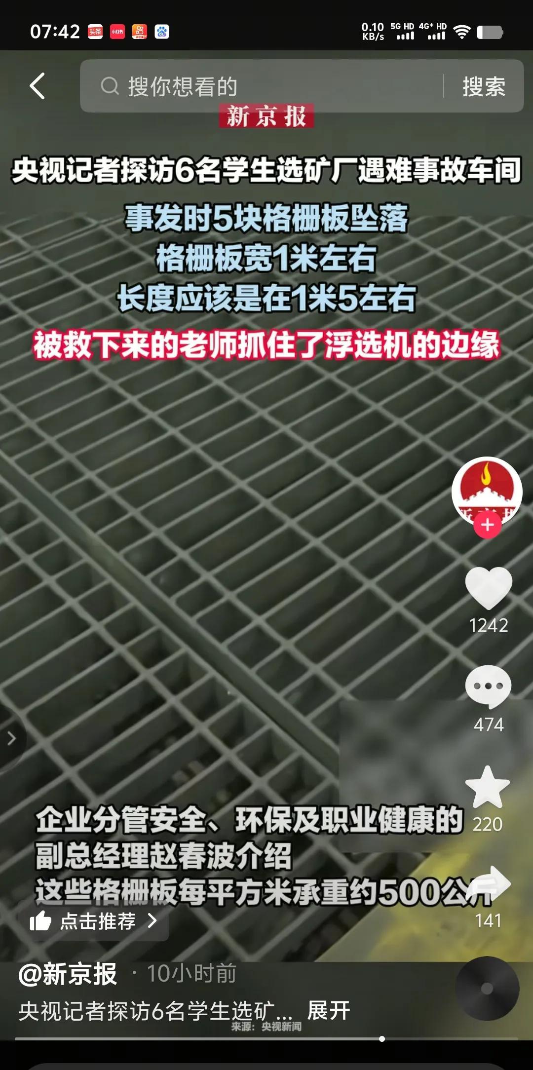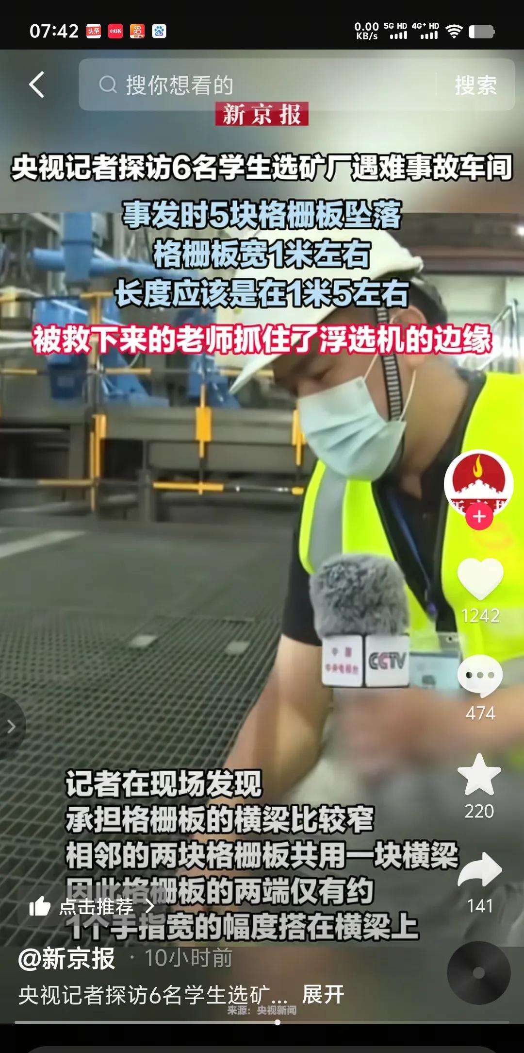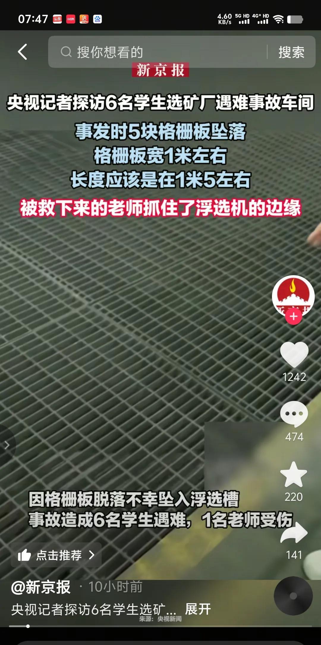5块格栅板坠落,每块宽1米,长1.5米,每平方承重约500公斤。相邻的两块格栅板共用一根模梁,也就是说一根梁上担着两块格栅板,两端仅有一手指宽(差不多20毫米)的幅度搭在横梁上,采用点焊方式与横梁固定。 除了检修,平时根本没有员工的区域,面对55名师生的参观,没有事先全面排除隐患,没有设围挡,没有设警示标牌,相邻的格栅板除了点焊,没有再用卡扣固定…,你能简单的说它就是一起事故吗?不怕天灾,不怕意外,就怕人为的因素存在。 六条鲜活的生命瞬间戛然而止,只有老师一人抓住浮选机边缘,得以幸运存活。惨痛的教训告诫我们,任何悬空的地方非必要情况尽量别踩,只有脚踏实地才是最安全的。