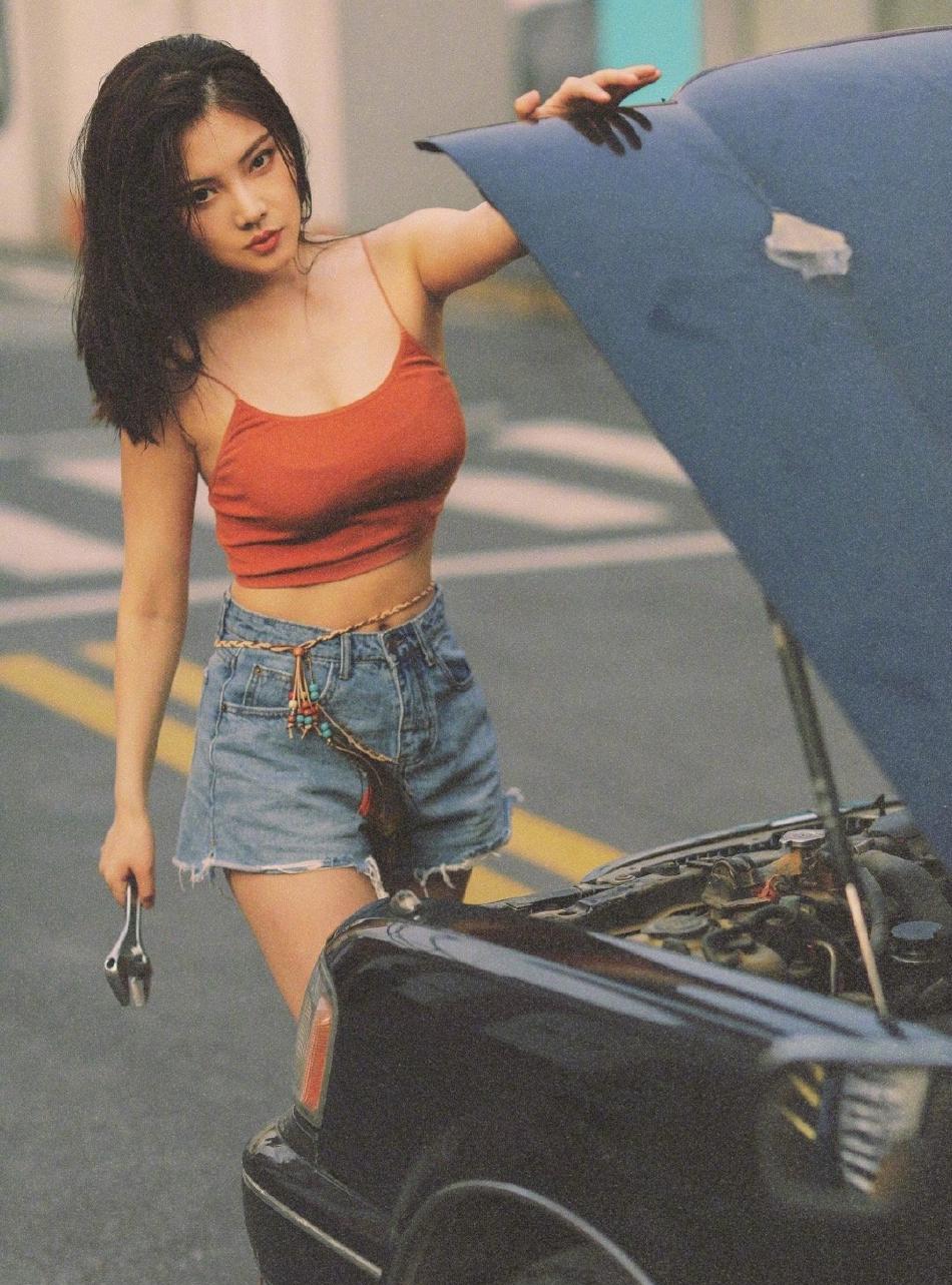 徐冬冬身穿橘红色短款吊带上衣,下搭蓝色牛仔短裤,脚蹬棕色长筒靴。她以中长湿发造型出镜,妆容精致。整组照片的色调采用复古暖调,胶片质感强烈。