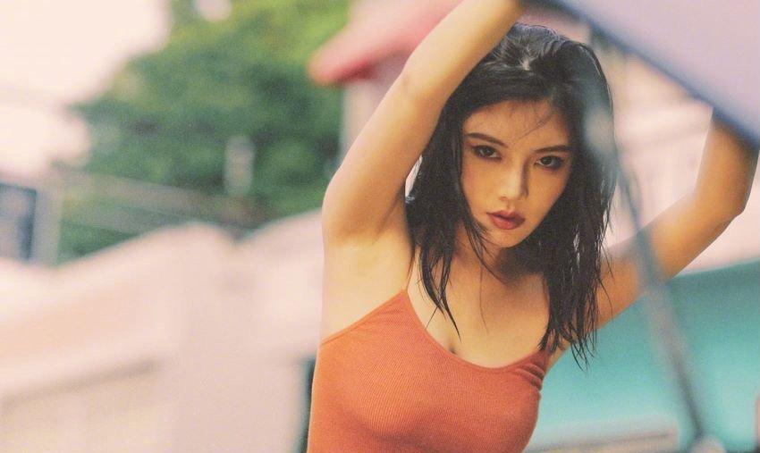 徐冬冬身穿橘红色短款吊带上衣,下搭蓝色牛仔短裤,脚蹬棕色长筒靴。她以中长湿发造型
