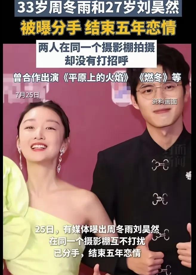 周冬雨刘昊然被曝已分手 说实话,当初就不看好他俩在一起。 7月25日,周冬雨刘昊然出现在同一个摄影棚,但二人见面并没有打招呼。周冬雨当天一身黑色服饰,卷发。她在摄影棚里与工作人员聊天,看上去情绪很好。而刘昊然虽然与周冬雨在同一个棚内,但两人没有打招呼,工作结束后各自乘车离开。此前一直有传二人是恋人关系,现在看关系如此默契,实锤了。二人结缘于2020年的一部电影《平原上的火焰》。