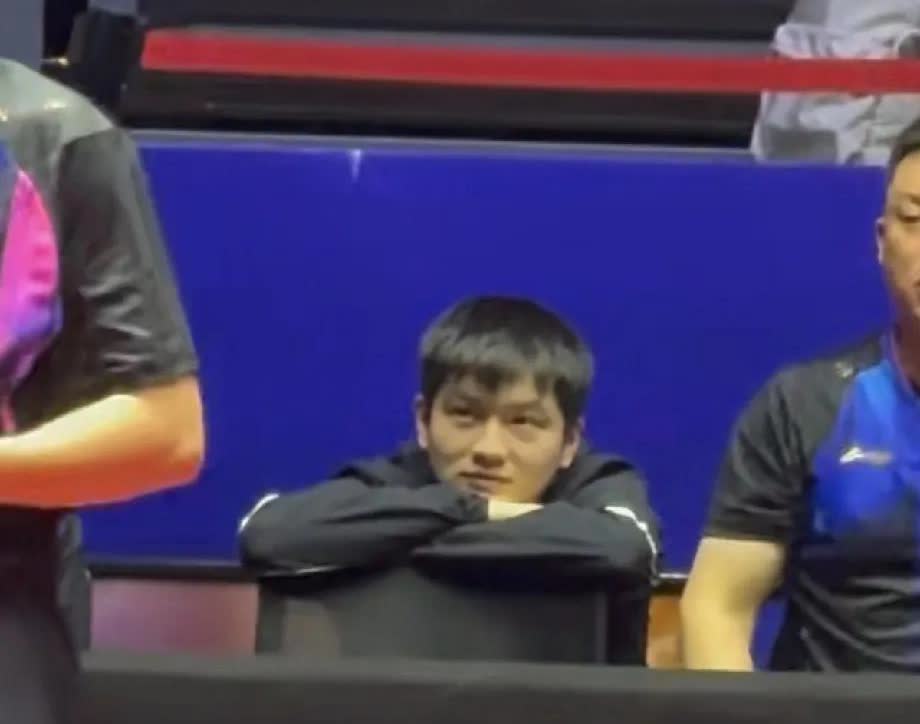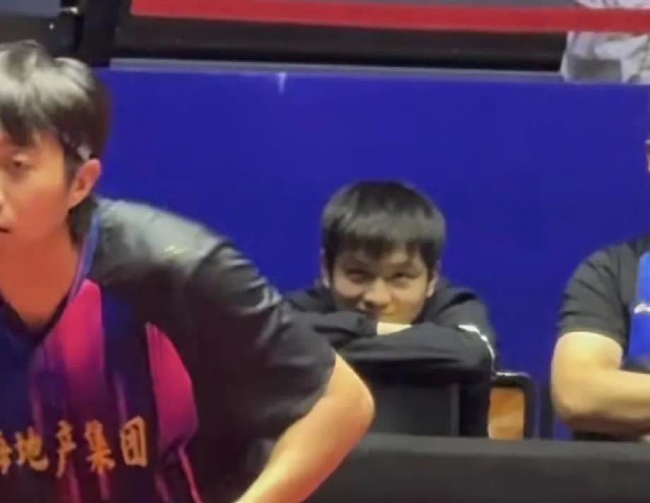 是坐在场下卖萌的小胖哈哈哈 场上是队友周恺和赵子豪两人的组合比赛,场下就是小胖坐着,双手伏在椅子上脸靠在手上的小胖,这又是萌出了新高度呢 还时不时的笑看着队友,又左看看右看看周围,队友第一局发挥的不错,3:2拿下了第一局,心情不错呢,难怪小胖一脸微笑看着感到欣慰啊哈哈哈