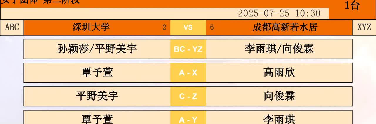 孙颖莎平野美宇出战首场比赛! 乒超联赛常规赛第二阶段比赛即将开始,深圳大学孙颖莎、覃予萱、平野美宇出战首场对阵成都高新若水居的比赛! 孙颖莎与平野美宇搭档双打,这对组合以往并未出现过,期待两人配合能带来精彩的表现!覃予萱是第一单打,平野美宇三单,这个阵容是深圳大学的积极变化,也在探索不同的阵容,逐步磨合来出战不同的对手,本场比赛蒯曼休战!