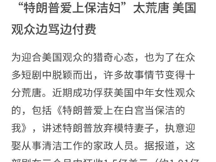 嗯,现在在大美利坚有两个短剧非常流行,一个是“税宗爱上在白宮当保洁的我”,大美利