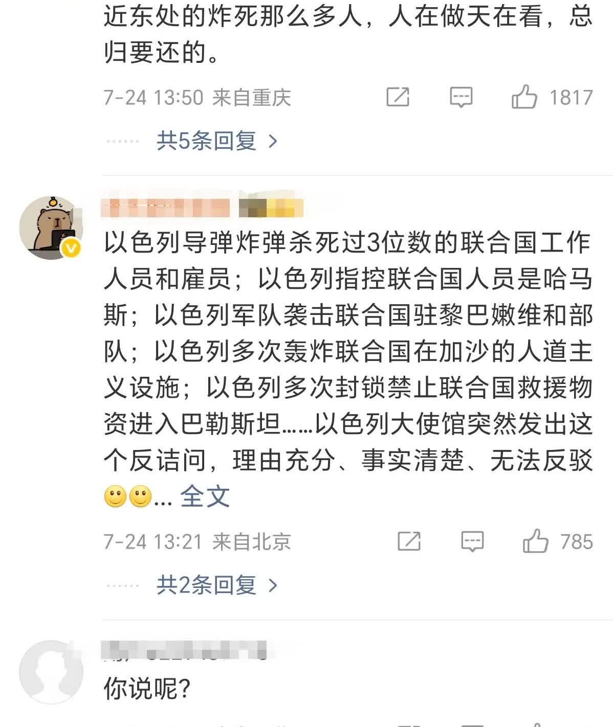 我从未见过如此厚颜无耻之人。 以色列和联合国在东大Vb上吵架。以色列驻华使馆(lP在香港)质问联合国:950辆援助卡车在加沙等待联合国分发,为什么联合国不分发? 底下的评论区,骂小以骂得粪水横流:人家一分发物资,你就去炸。 你把人家联合国近东救济机构的工作人员手拷起来了,衣服脱了,被你扣押,打死了一批人,又饿晕了一批人,你让他们咋个整?!还拿签证卡人,不让外界的人进入加沙。 以色列的外宣堪称灾难级。明知在东大发文会被骂,它还主动找骂。当然人家也不在乎这些。毕竟,只要它的好大儿阿美还活着,以色列就能继续对着全世界哈气。