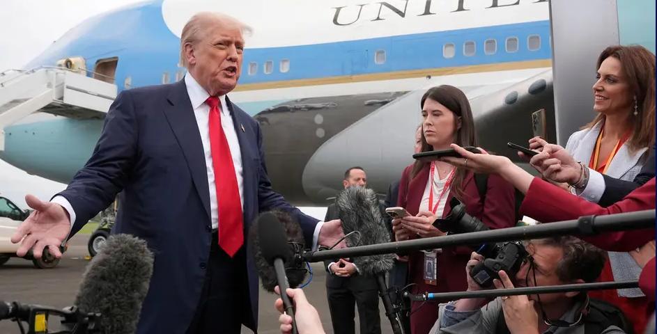 飞抵英国的特朗普,心情大好,在专机落地埃尔郡普雷斯特威克机场后,他面对记者侃侃而谈。 这位美国总统谈到了一系列广泛的话题,包括非法移民、杰弗里·爱泼斯坦丑闻、对斯塔默爵士和肖恩·康纳利的看法。 特朗普随后离开空军一号前往特恩伯里,这是他在苏格兰的高尔夫球场之一。此行程的一部分将包括位于阿伯丁郡的一个高尔夫球场的开业典礼,该球场被誉为 "高尔夫球界最棒的 36 洞球场"。 有意思的是,美国空军一号降落机场,受到当地民众的围观和追捧。