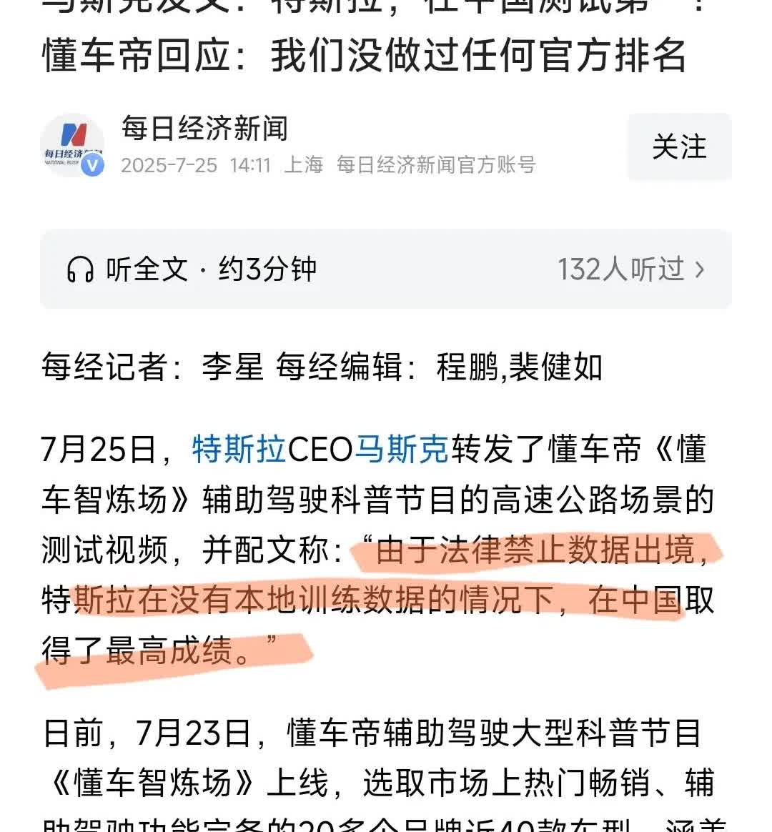 鸿蒙智行回复懂车帝的关于智驾的测试说“不予置评”。 特斯拉老总马斯克回复说,因为训练的道路数据不能出境,但目前还取得最好成绩,希望以后都能通过这6项测试。 一位高傲的回复懒得评论,一位整天躲在办公室里面偷情,居然都是大家喜爱和崇拜的对象,这个世界的真相真是无法想象。
