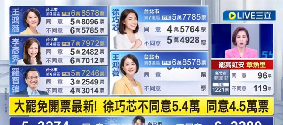 大罢免开票最新进度:赖清德玩死自己了,民进党快接近惨败!开票接近三分之二,24席“立委”罢免案,没有一席“同意罢免票”能领先“不同意罢免票”,连新竹市长高虹安的“不同意罢免票”也大幅领先。很多“立委”开始庆祝了。 民进党会不会连一席“立委”都罢免不了?不排除这种可能。民进党秘书长林右昌、台行政机构负责人卓荣泰,离下台越来越近。从目前开票来看,有几大特点: 一,台北市5席“立委”全部过关几成定局。连被民进党纳入“必须打掉”的王鸿薇、徐巧芯两席,“不同意罢免票”大幅领先“同意罢免票”。 二,高危名单中的三人,罗廷玮(台中)、黄建宾(台东)趋稳,各界认为最危险的叶元之(新北),还有拉锯中。 三,桃园“次危”名单中涂权吉过关可能性也大增。 如果这次大罢免民进党只罢掉1席甚至吞0蛋,那么,赖清德将提前权力跛脚,未来3年多执政都算是“垃圾时间”,他的2028年连任梦也将提前破碎。 赖清德当下立刻的压力就是来自民进党内派系清算,要求处理党内“战犯”,“内阁”大幅改组。民进党秘书长林右昌、台行政机构负责人卓荣泰将成为“头号战犯”,下台不可避免 对赖清德而言,更严重的后果是,他将因为大罢免失败而被岛内民意汹涌反噬。“愿赌不服输”“恶意搞乱台湾”将成为他撕不掉的政治标签,“讨厌民进党”“赖清德下台”将成为往后持续的岛内民意,这势必如泥石流般冲击民进党2026年“九合一”选举以及2028年台湾地区领导人和“立委”选举,赖清德连任梦恐怕也因此提前破碎。 在受到蓝白牵制的赖清德,在两岸关系上想挑衅也没有太多筹码,台海局势暂时可松一口气。 如此一来,卢秀燕稳住阵脚,民众党主席黄国昌挺蓝有功,2026年及2028年选举“蓝白合”将成定局,2028年“卢昌配”挑落民进党机会大增。
