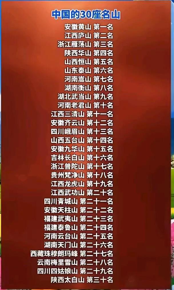 中国最美的名山排名,看看你都知道哪些各山。中国地大物博,名山众多,要说最美的30大名山排名,很难有个定论,但其中一些名山确实美得惊人。 像安徽黄山、江西庐山、陕西华、四川峨眉山等名山都非常出名,但我今天说的是贡嘎山虽然没在排名之中,但贡嘎山海拔7556米,有“蜀山之王”的称号,周边145座冰峰环绕,71条现代冰川壮观至极。珠穆朗玛峰就更不用说了,世界之巅,海拔8848.86米,独特的高原冰川、雪山群峰和日出云海,震撼人心。黄山也值得一提,云海翻涌,奇松破石,七十二峰在霞光中宛如仙人的翡翠簪。泰山作为五岳之首,帝王封禅之地,十八盘、南天门承载着深厚文化,夜爬看日出更是一绝。这些名山各有特色,都是大自然的馈赠,大家还知哪些名山,你最想去的是哪里,欢迎留言讨论。