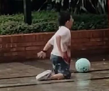 昆明突下大暴雨,有一个小男孩童在暴雨中拿一个浅蓝绿色的球快乐无比地玩耍。 要么匍