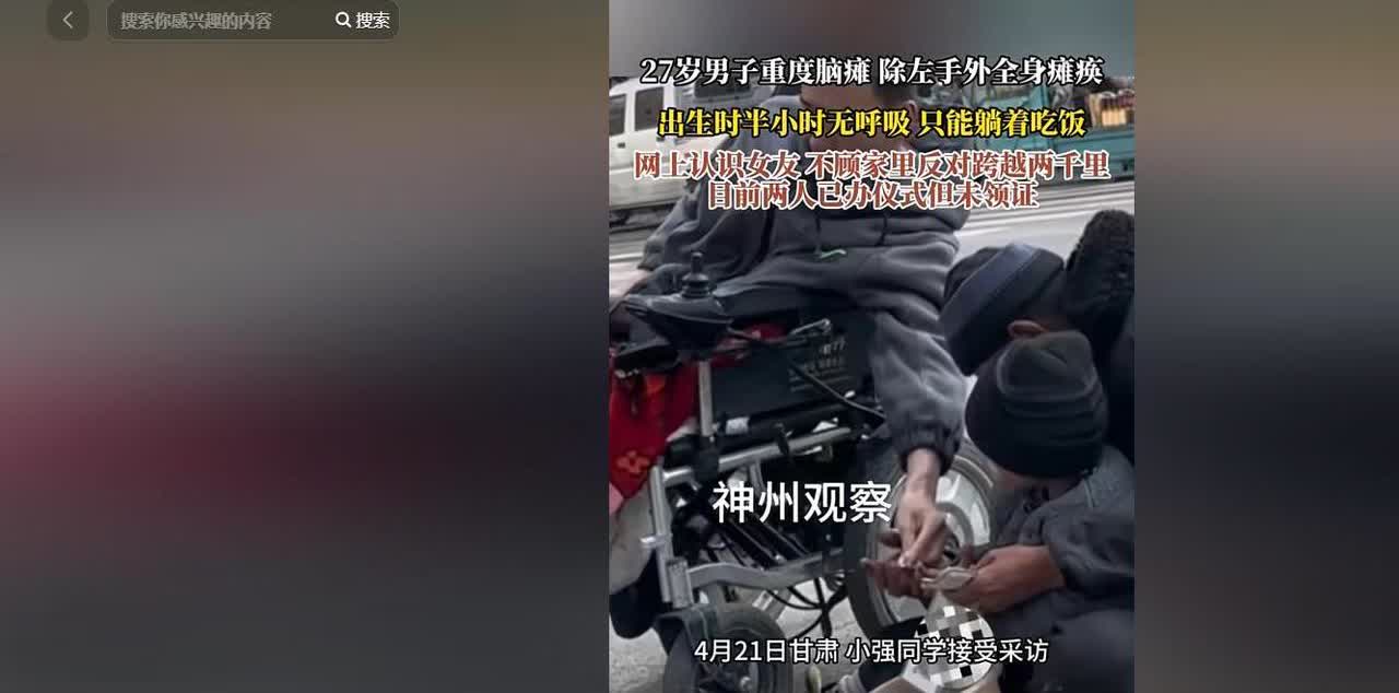 顶级恋爱脑诞生了!4月21日,甘肃临夏,一脑瘫男子除左手外全身瘫痪,每天就只能躺