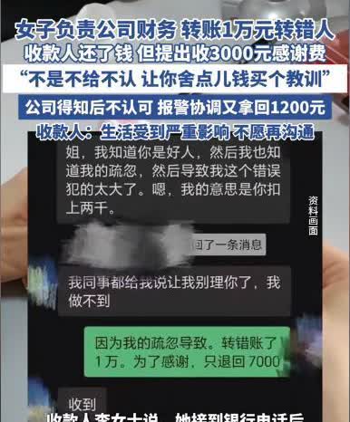“占便宜上瘾?”近日,陕西西安,一女子在银行ATM机转账10000元,因写错账户的一个数字,把钱转错了,没想到,对方只同意归还7000,私自扣下3000感谢费,女子觉得太多了,几百她能接受,但对方说:让你舍点儿钱买个教训,我这个人心眼好,否则我一分都不退你,你能把我咋滴?女子一怒之下报了警,结果很意外。 在陕西西安,有个因为转账弄错而闹起来的事情。有个女士,咱们就叫她张姐吧,她在公司管钱的。有一天,张姐在自动取款机上给公司转账,一不留神,把10000块钱转到了一个不认识的人,李女士的账户里。 张姐发现转错了,赶紧找银行帮忙,拿到了李女士的电话,想让李女士把钱还回来。可没想到,李女士不但不热心,还说要扣下3000块钱当“谢谢费”,才肯把剩下的钱退回来。张姐一听,又惊又气,跟李女士商量了半天也没用,最后只能报警。 警察来了以后,李女士虽然有点松口,但还是坚持要留下1800块钱,说是给自己“长记性”。张姐这下又气又急,她知道这钱是公司的,自己先犯了错,不能再让公司吃亏。可李女士这么做,简直就像是趁机敲诈。这件事在网上炸开了锅。有人说,自己也碰上过这种事,对方要“好处费”,但也有人直接报警,钱一分没少地拿回来了。网友们大都觉得,这种爱占小便宜的行为不能惯着。 后来,警察出面帮忙,李女士退了8200元,但还硬要留下1800元。张女士心里不痛快,可也没办法,只能认了。她说,接下来要通过法律手段把那1800元也要回来。这事儿不光让大家看到有些人对“不劳而获”这事儿想岔了,也提醒大家:转账的时候可得小心,遇到事儿得果断维权。