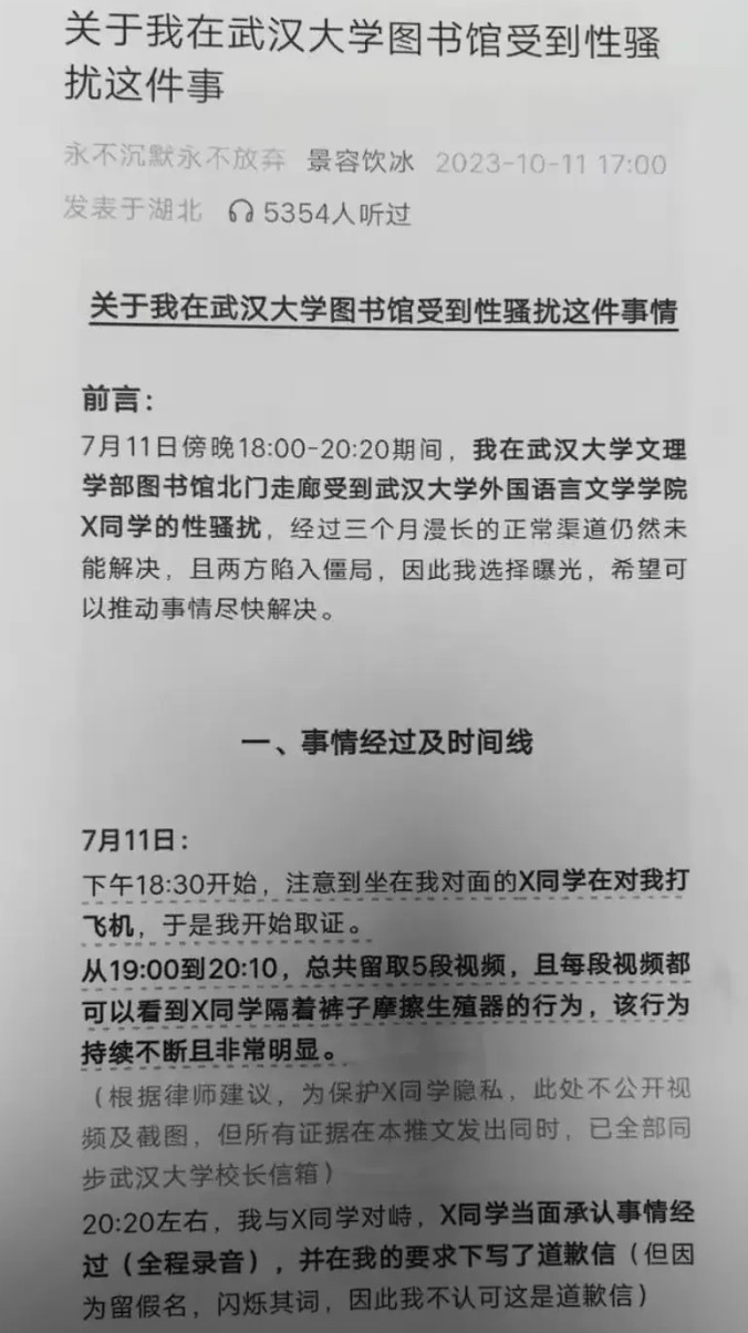 武汉大学图书馆性骚扰事件,网暴帖子发出来当天,武大就成立了工作组进行调查,行动不可谓不迅速。随即,就发布了处分决定,给予肖某某记过处分,甚至为此还专门下发了红头文件。然而根据正规媒体的报道,其实说肖某某性骚扰,武大并没有什么确凿的证据,武大相关负责人曾明确表态,排除性骚扰,记过处分只不过是为舆情降温的应急措施。然而这份处分决定,不但没有使舆情降温,反倒如烈火烹油,起到了推波助澜的作用。此决定一出,肖某某性骚扰的大帽子算是正式戴上了,他彻底被推到了风口浪尖上。