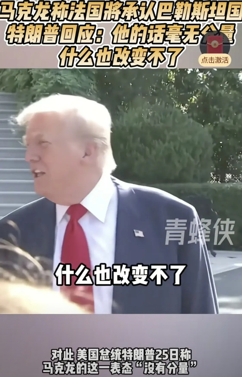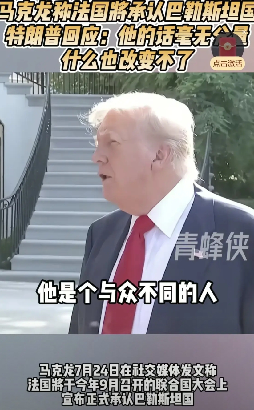 英法德联合声明:我们坚决反对以色列主权强加于巴勒斯坦被占领土。 马克龙:法国承认巴勒斯坦国家。 特朗普:马克龙是一个与众不同的人。但有个好消息,他说什么不重要,他什么改变不了,没有什么分量。他是个好人,我喜欢他。