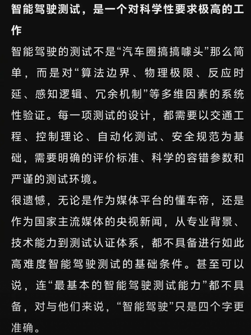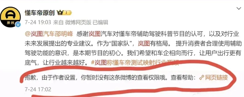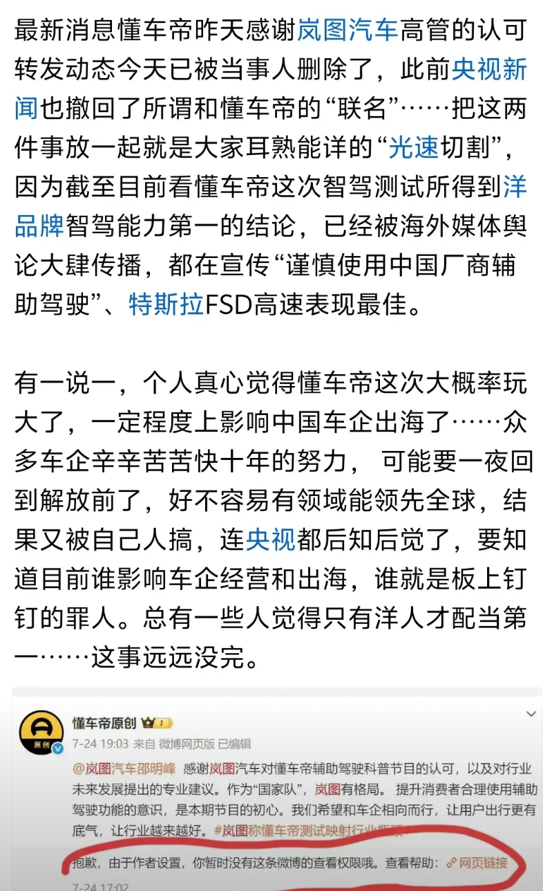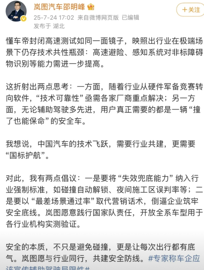 岚图高管邵明峰两天之内一前一后两次发文的态度很有意思。 第一次,他作为首位站出来回应DCD测试事件的车企高管,发文表态顾左右而言他,并没有对DCD测试中有争议的地方提出自己的立场。甚至DCD还专门转发岚图高管邵明峰的博文并感谢他的认可。然而,众所周知,岚图的好几款车型搭载了华为乾崑智驾和鸿蒙座舱,岚图品牌也正是因为有了华为技术赋能才能成为国产MPV的销冠。在这个背景下,对自己家产品正在使用的重要智能辅助驾驶系统却没有自己应有的立场和态度,反而顾左右而言他。 岚图高管邵明峰的言论,也让网友们想起了一个人:奇瑞前智驾负责人谷俊丽,仿佛又看到了当初谷俊丽对FSD极尽赞美的样子。 有网友表示,经常看到岚图的海报说自己的车子有华为智驾加持,本来打算问界和岚图二选一,现在看来要慎重考虑了。 不知道是不是看到网友们的强烈反应才后知后觉?岚图高管邵明峰最新的博文突然态度大变。事隔两天后,他再次就DCD测试的事情发文,不仅说中国辅助驾驶靠全链路创新与技术积累,实现从追赶到并跑,表示支持中国零部件企业发展,坚持自主研发,还强调一番岚图如何如何与华为强强联合,总之态度和两天之前截然不同了。 其实,有博主早就指出,想尽办法拉下华为乾崑而把洋大人推上第一席位的行为,已经不仅仅是某个品牌或企业的事情,而是事关中国新能源汽车出海的大事了。毕竟,自己人测试出全部国产汽车品牌的智驾技术居然“不如”洋品牌的结果,最后让洋老板转发给全世界看,关键是这个测试的过程还充满了争议,这个事情就耐人寻味了。
