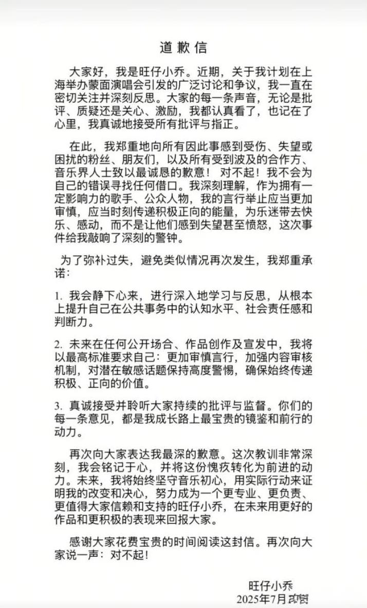 “旺仔小乔”发布了道歉信,但很快被网友发现这封道歉信是用AI写的,毫无诚意可言,糊弄粉丝,糊弄网友! “旺仔小乔”的演唱会也不开了,将会延期,主要是她也不敢开了,现在她的粉丝大部分已经倒戈,不再支持她了,如果继续开演唱会,估计会有粉丝朝她扔臭鸡蛋! 她的道歉信中有这么一句话,很有意思,“作为拥有一定影响力的歌手、公众人物”,公众人物我认可,毕竟还有2000万粉丝,歌手就算了吧!大部分都是翻唱,原创的歌曲也没有任何影响力,试问有几个人听过?好听吗? 说白了,“旺仔小乔”就只是一个网红罢了!没有什么代表作,粉丝多了人就飘了,评论质疑《年轮》的原唱,不认可汪苏泷,只承认原唱是张碧晨。 “旺仔小乔”年龄不大,只有20岁,但人却狂妄自大!不尊重前辈,不善待粉丝,演唱会蒙面演唱毫无诚意,这样的网红不塌房谁塌房! #旺仔小乔# #网红塌房#