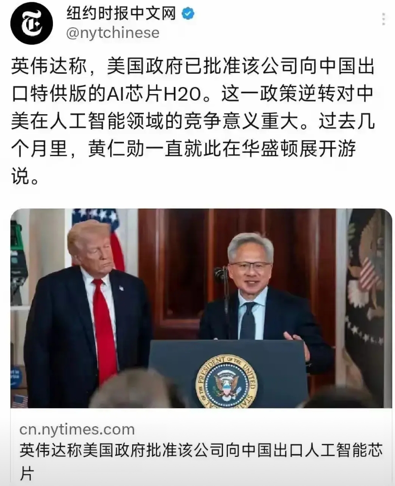 英伟达公司老板黄仁勋是美籍华人,虽然英伟达公司算是当今时代的科技领先者,但是黄仁勋是地道的美国人,他也是很爱国的人。前几年美国卡我们的脖子时,英伟达的芯片对中国是绝对禁止出口的,虽然科学没有国界,但他认为科技企业是有国界的。 几年过去,中国的芯片产业在科研、技术上逐渐突破,有超越美国之势,为了让中国停止或减慢芯片的研发,英伟达公司的黄仁勋采取与美国政府一致的行动,来中国推销他们积压的"阉割版"的H20,中国政府和国内芯片科研企业能上当吗?答案是否定的。 首先国安部已公布外国芯片留有后门,谨慎购买; 其次是360公司老板周鸿祎说得好,360芯片都采购华为公司的产品,虽然华为芯片存在缺点,但华为公司的芯片性价比高。 美国人爱美国,中国人更应爱中国。